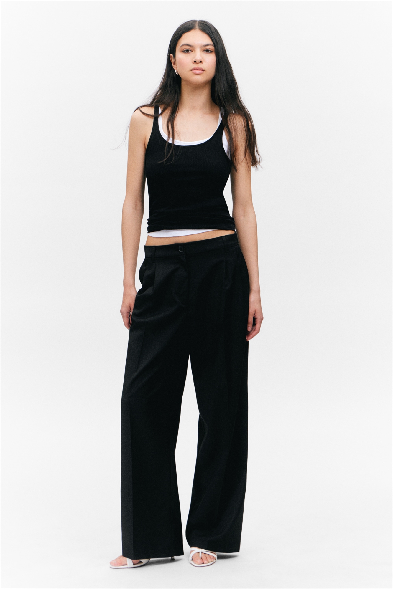 Брюки с широкими штанинами, складками спереди для придания объема, петлями для ремня и косыми боковыми карманами. Регулярный крой. Широкая штанина. Имитация задних карманов. Ширинка на молнии с застежкой на пуговицу. Легкая ткань. Изготовлен из переработанного полиэстера.