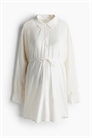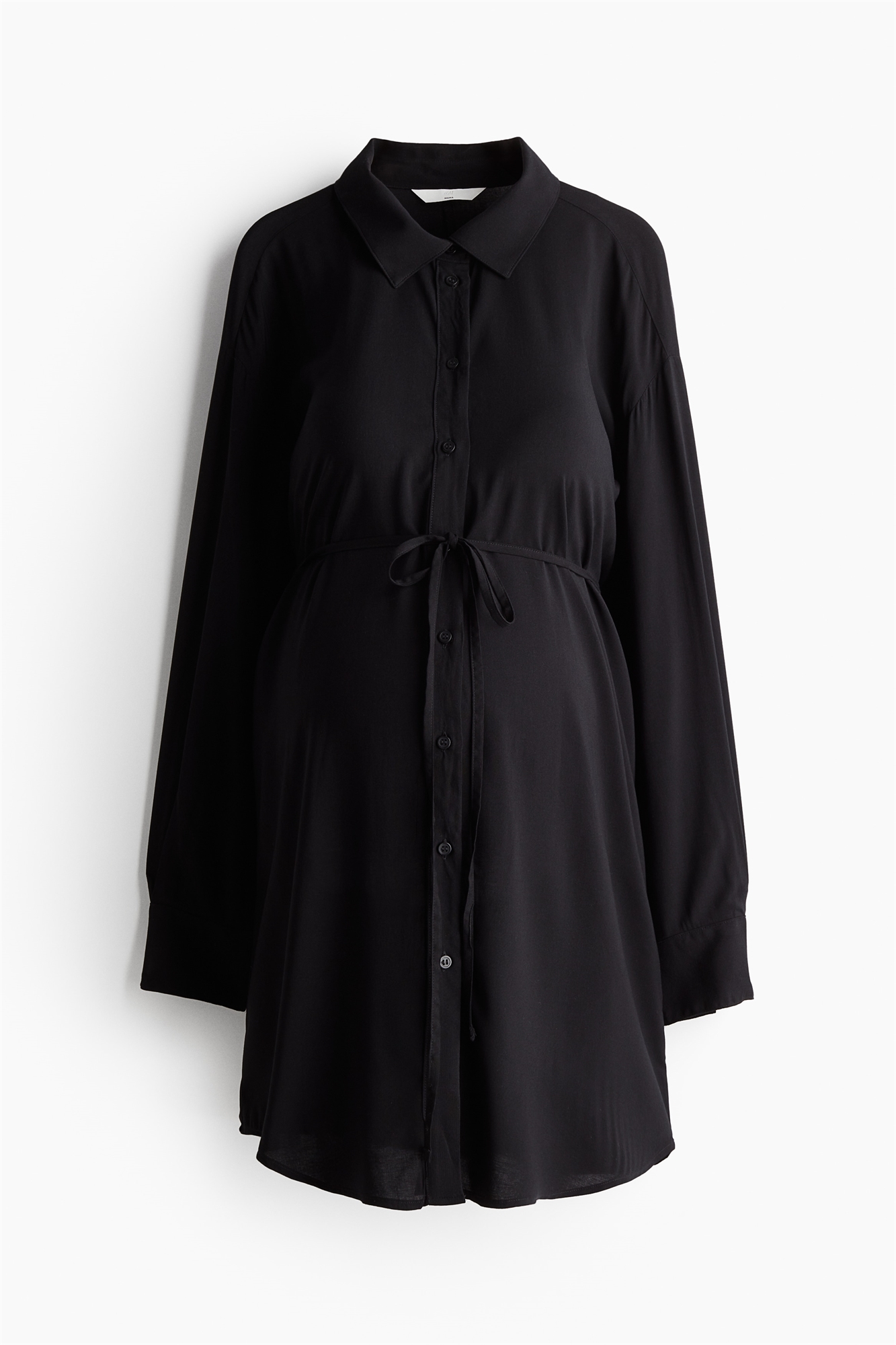 Рубашка из вискозного полотна с воротником, пуговицами спереди и узким съемным поясом-завязкой под бюстом. Спущенные плечи, длинные рукава с манжетами на пуговицах и закругленный подол. Рубашку можно носить как во время, так и после беременности.
