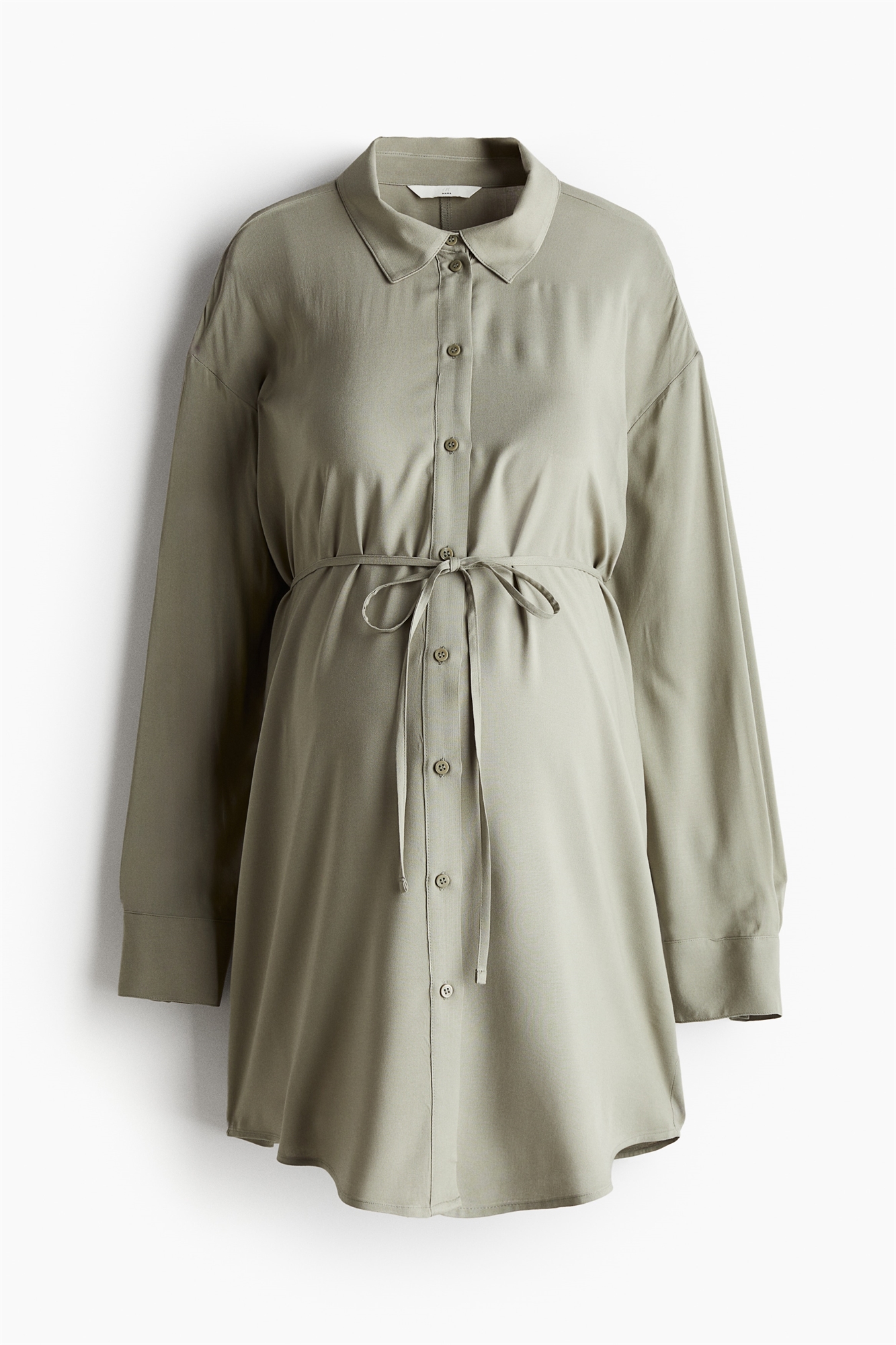 Рубашка из вискозного полотна с воротником, пуговицами спереди и узким съемным поясом-завязкой под бюстом. Спущенные плечи, длинные рукава с манжетами на пуговицах и закругленный подол. Рубашку можно носить как во время, так и после беременности.