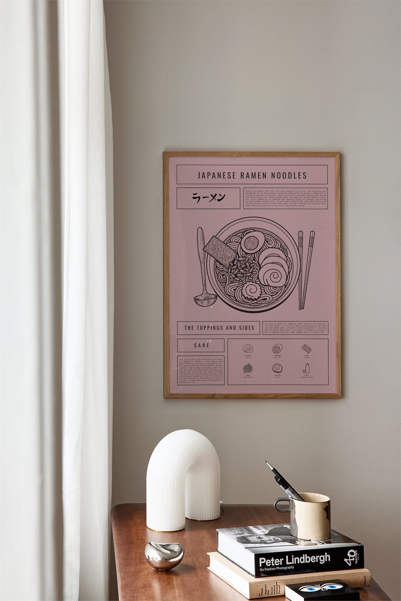 Модный типографский постер с иллюстрациями, изображающими японское блюдо рамен. Принт выполнен в тусклом розовом цвете, где черный шрифт и иллюстрации создают холодный контраст. Фон имеет зернистость, которая придает мотиву большую глубину.