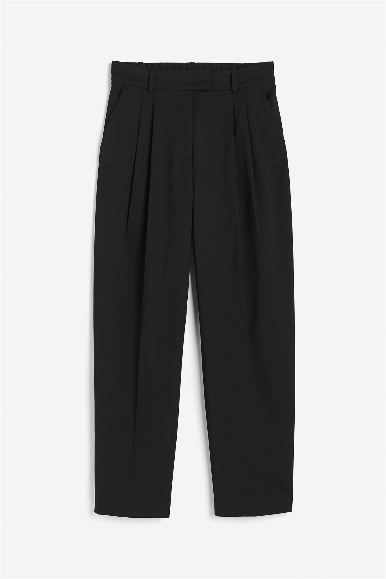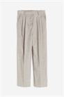 Брюки длиной до щиколотки из тканого материала. Высокая талия со складками спереди и закрытой резинкой сзади, ширинка на молнии с застежкой на крючки и глазки. Боковые карманы, втачные задние карманы и широкие, слегка зауженные ноги со складками.