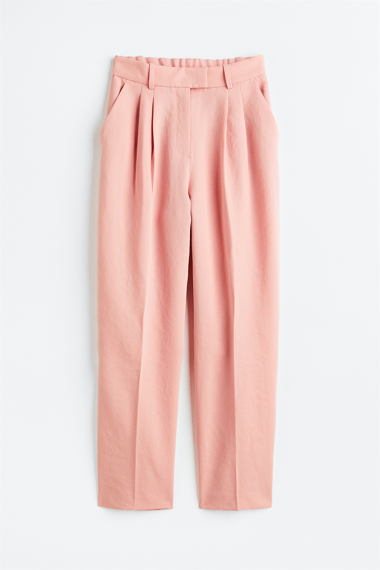 Брюки длиной до щиколотки из тканого материала. Высокая талия со складками спереди и закрытой резинкой сзади, ширинка на молнии с застежкой на крючки и глазки. Боковые карманы, втачные задние карманы и широкие, слегка зауженные ноги со складками.