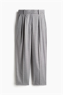 Брюки длиной до щиколотки из тканого материала. Высокая талия со складками спереди и закрытой резинкой сзади, ширинка на молнии с застежкой на крючки и глазки. Боковые карманы, втачные задние карманы и широкие, слегка зауженные ноги со складками.