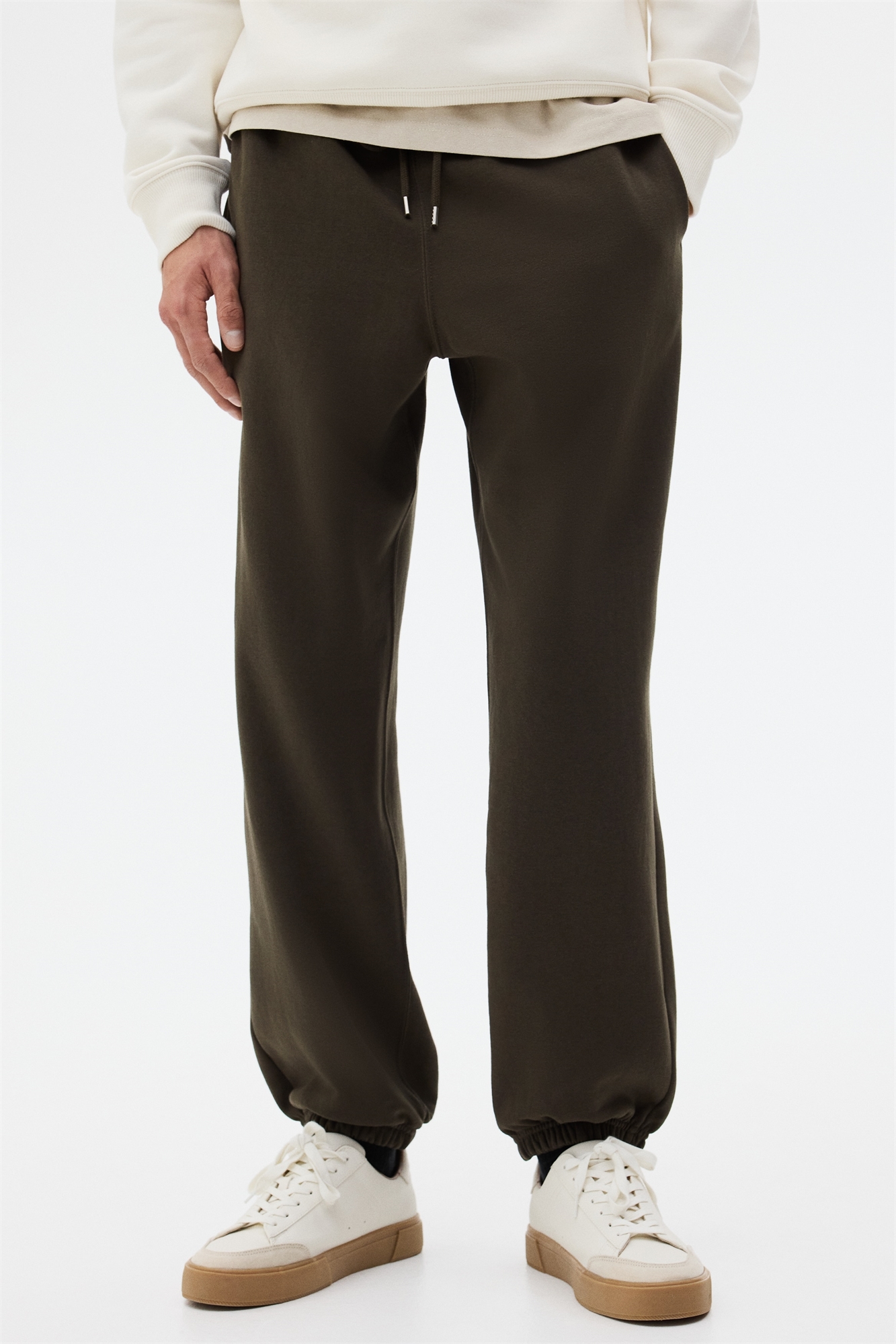 Тренировочные брюки средней плотности из хлопковой смеси с мягкой начесанной внутренней стороной. Эластичная резинка и шнурок на талии, карманы в боковых швах и ребристые манжеты. Свободный крой для непринужденного, но не слишком большого силуэта.