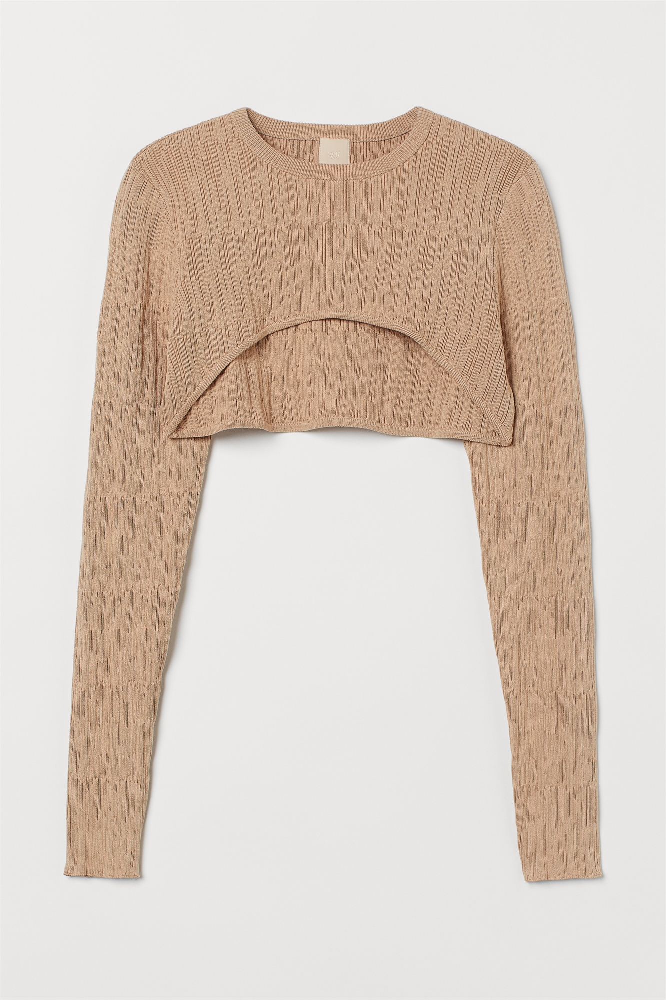 Облегающий топ-болеро из тонкого фактурного трикотажа с круглым вырезом и длинными рукавами.