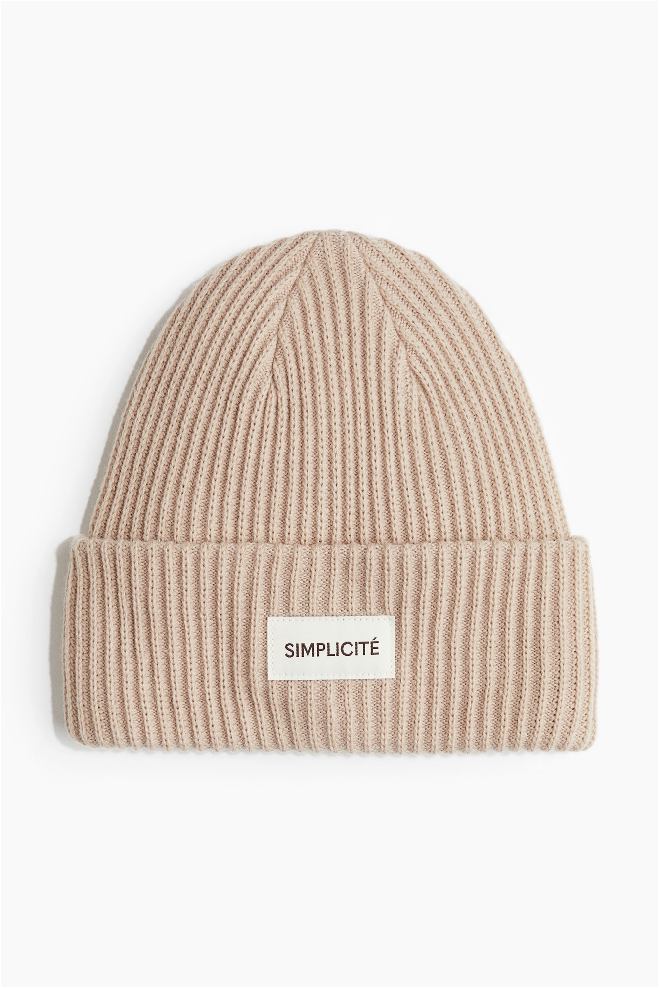 Шапка из мягкого трикотажа. Подвернутый подол с небольшой тканевой аппликацией спереди.