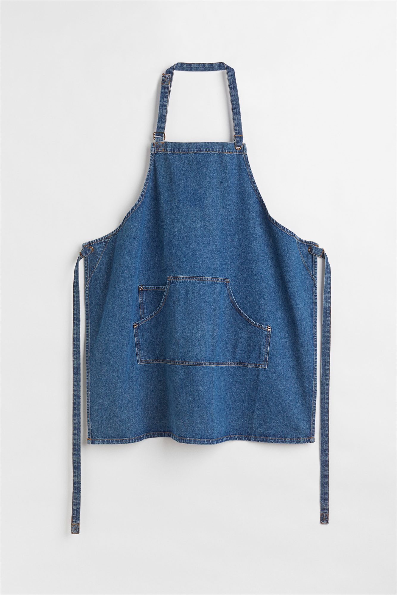 Фартук из хлопкового денима. Регулируемый шейный ремень с металлической пряжкой и завязки на талии. Один большой карман-кенгуру и один маленький, частично скрытый карман спереди.