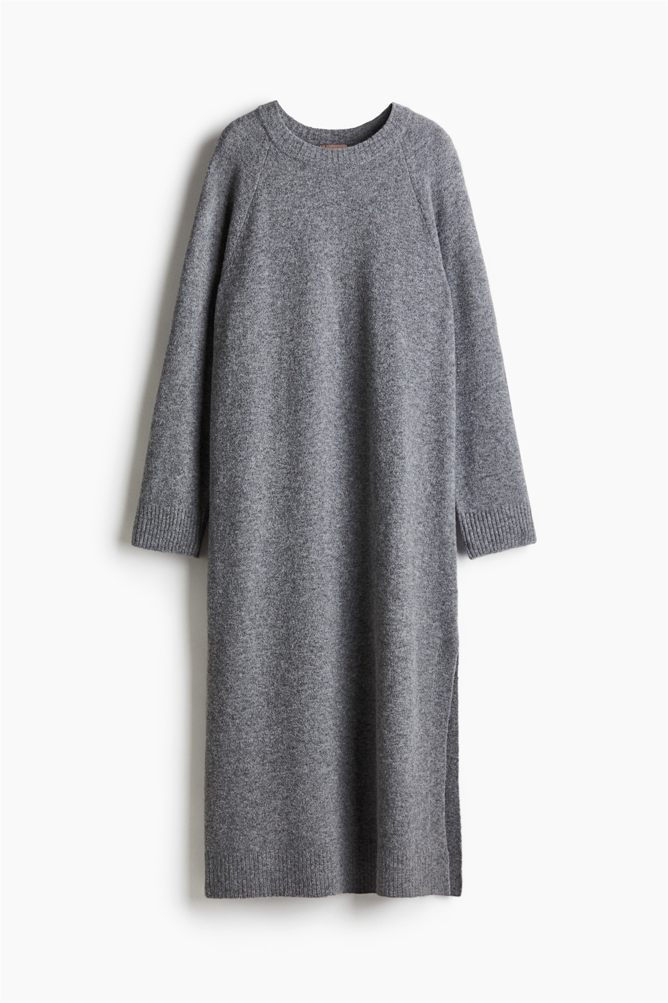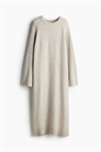 Платье длиной до щиколоток из тонкого трикотажа с добавлением шерсти. Круглый вырез, длинные рукава реглан и разрез с одной стороны. Окантовка по вырезу, манжетам и подолу. Без подкладки.