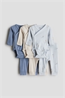 Комплект из трех боди и трех пар брюк из мягкого хлопкового джерси. Боди с длинными рукавами, завязывающимися спереди, и кнопками по бокам и внизу для удобства переодевания. Швы вокруг ножек для более удобного и плотного прилегания подгузника. Брюки с широкой складчатой панелью на талии и манжетами на подоле.