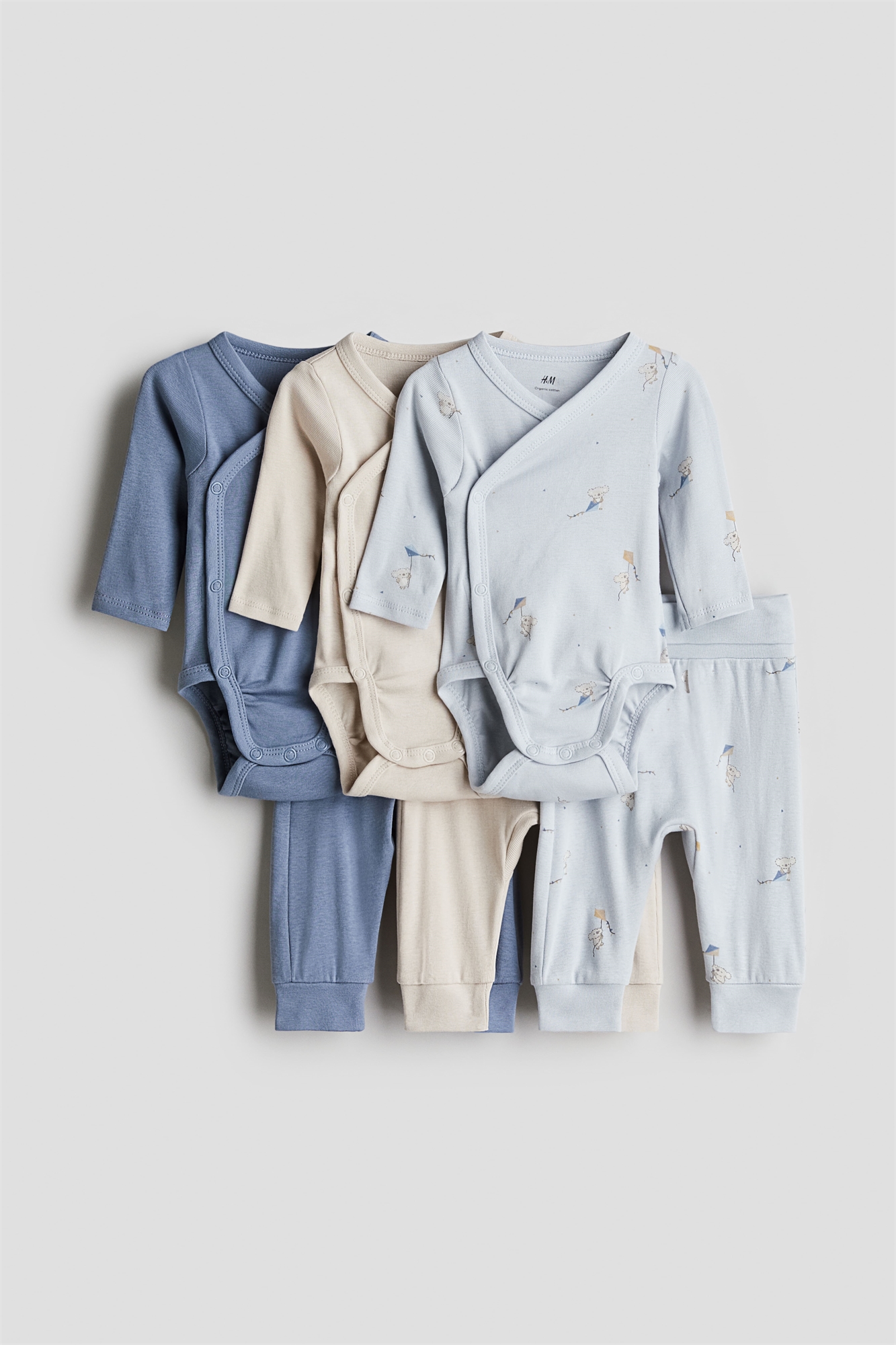 Комплект из трех боди и трех пар брюк из мягкого хлопкового джерси. Боди с длинными рукавами, завязывающимися спереди, и кнопками по бокам и внизу для удобства переодевания. Швы вокруг ножек для более удобного и плотного прилегания подгузника. Брюки с широкой складчатой панелью на талии и манжетами на подоле.