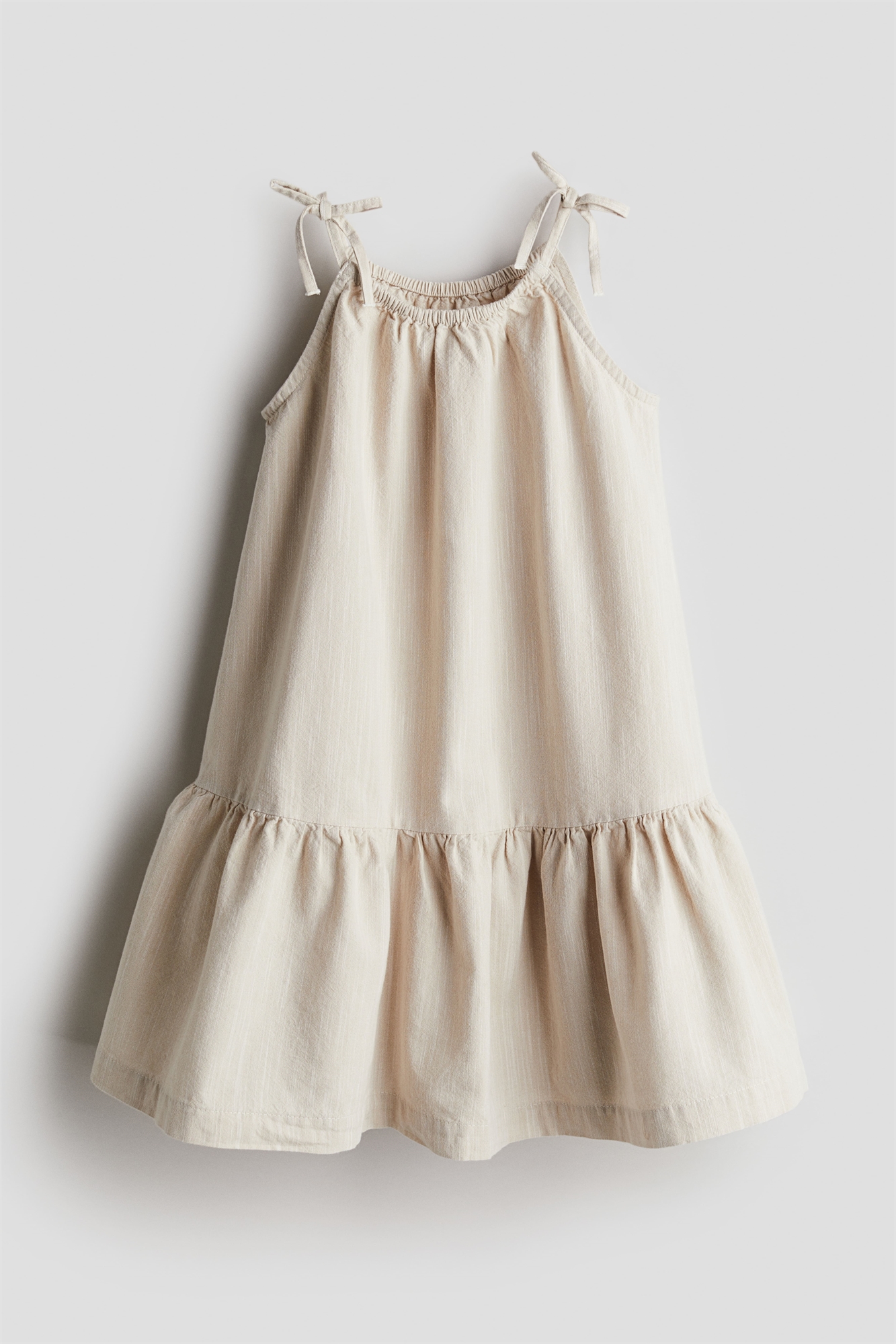Платье длиной до колена без рукавов из мягкого плетения. Узкий крой в верхней части с узкими бретелями, мягко собранные швы на талии и в юбке для создания ярусов.