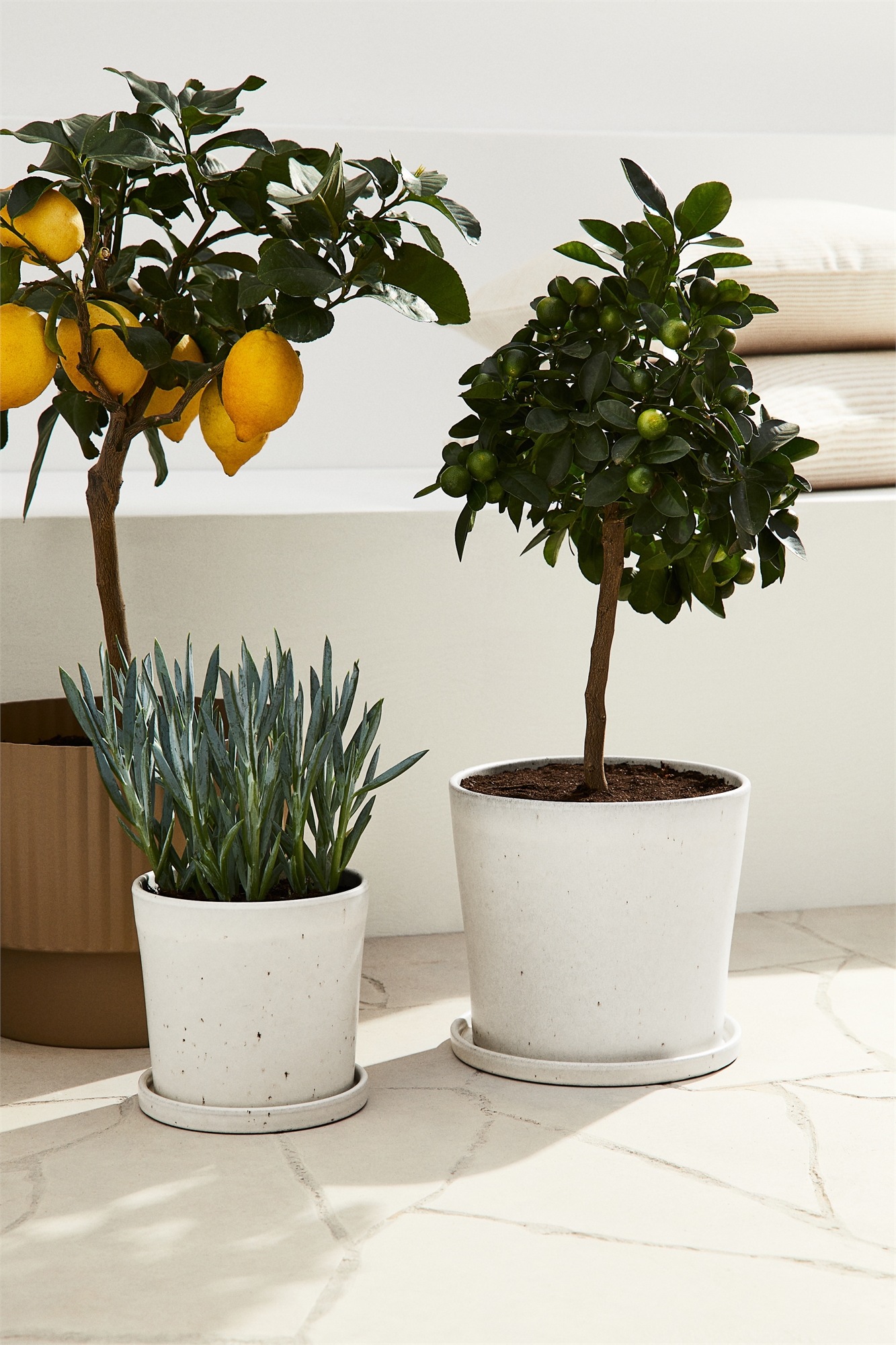 Большой глазурованный терракотовый горшок для растений с дренажным отверстием в дне и соответствующее блюдце. Диаметр блюдца 23,1 см. Высота горшка 23 см. Диаметр в верхней части 21 см.