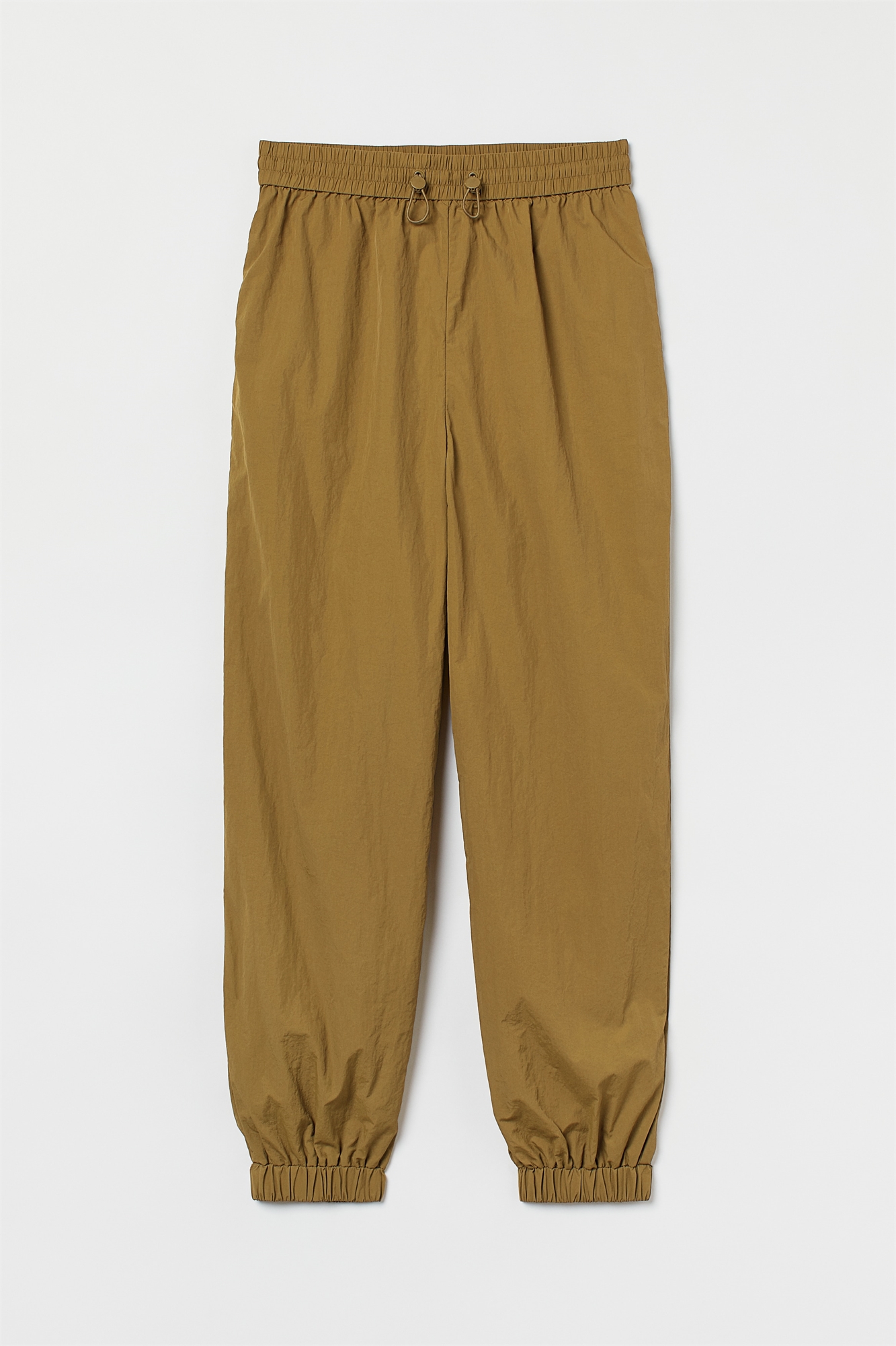 Брюки из переработанного полиамида. Брюки имеют высокий пояс с эластичным шнурком со стопперами, незаметные карманы в боковых швах и широкие штанины с узким эластичным поясом.