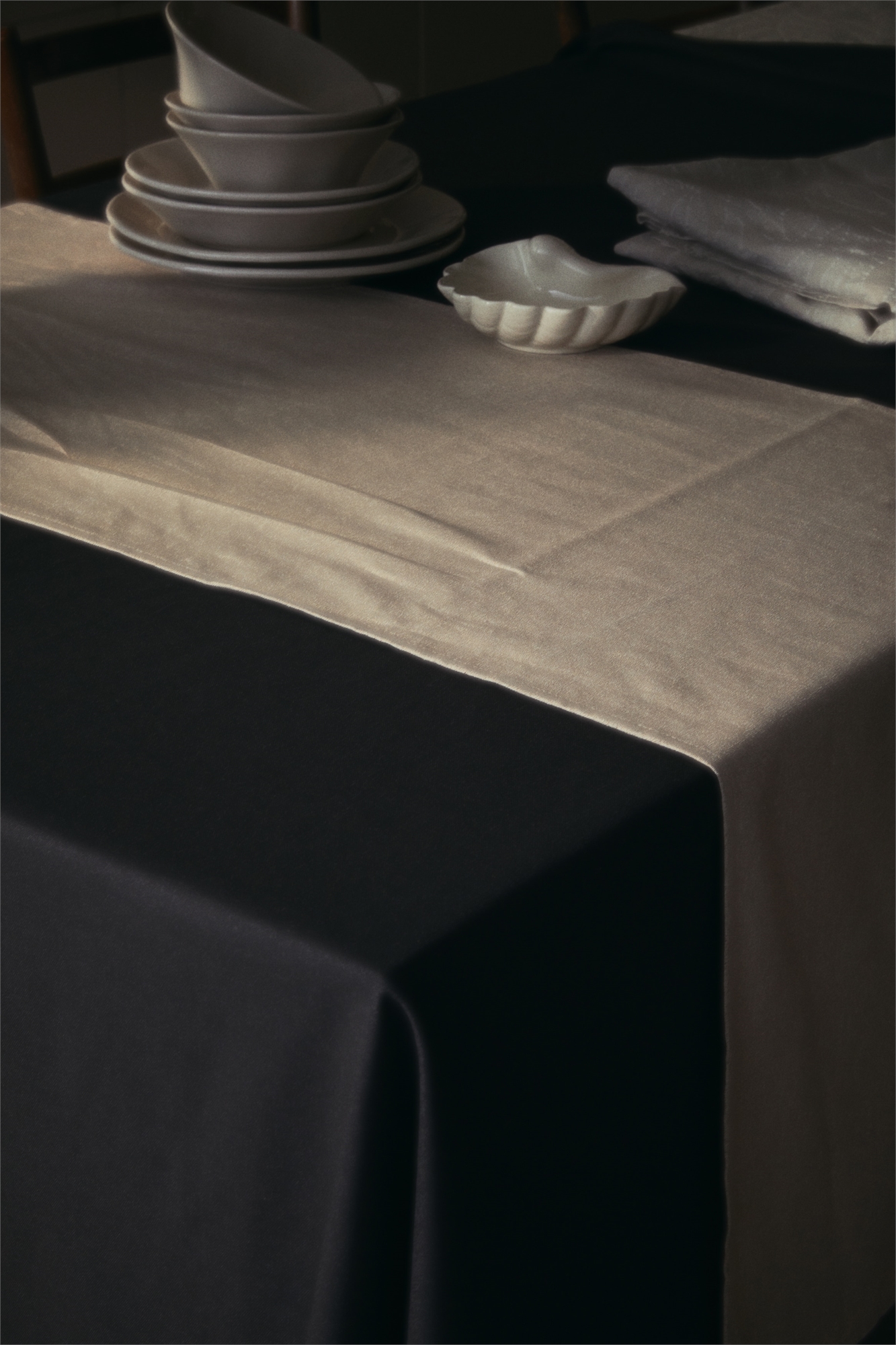 Скатерть из хлопка однотонного плетения, которую можно легко сочетать с различными салфетками и ковриками, чтобы придать сервировке стола индивидуальность.
