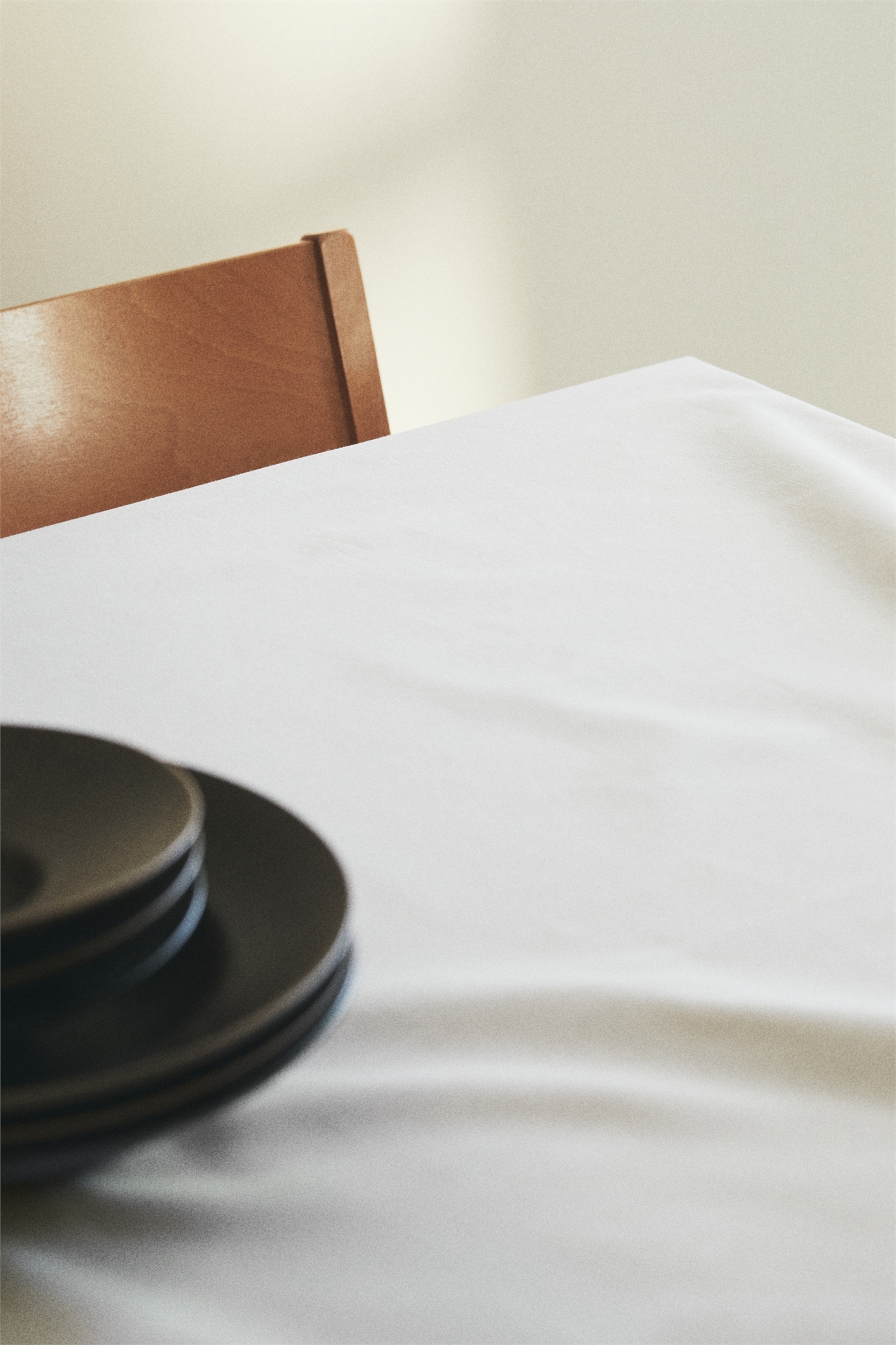 Скатерть из хлопка однотонного плетения, которую можно легко сочетать с различными салфетками и ковриками, чтобы придать сервировке стола индивидуальность.