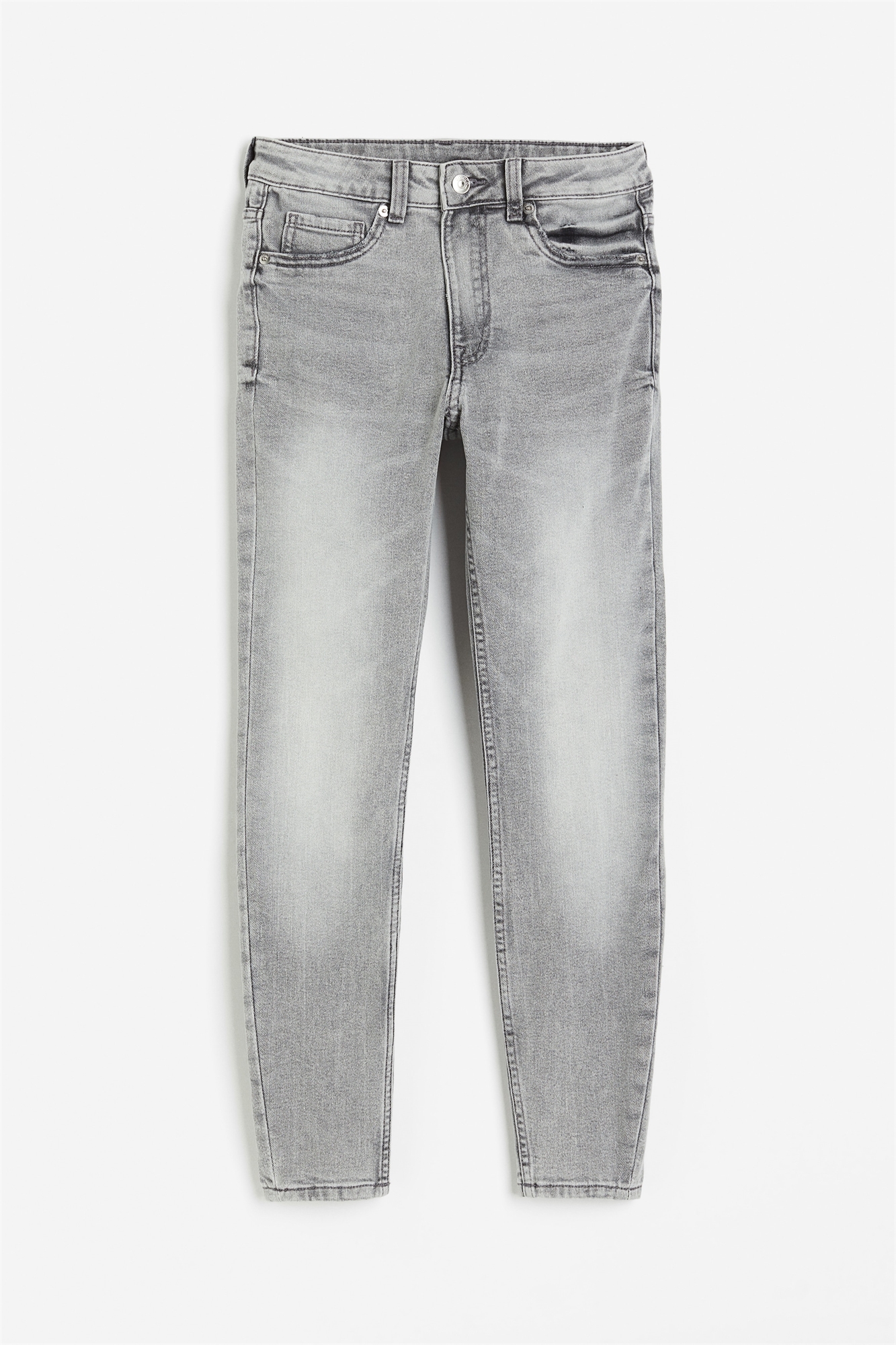 Джинсы из слегка эластичного денима с высокой талией, застежкой на молнию и пуговицу, фальшивыми передними карманами, настоящим карманом для монет, настоящими задними карманами и зауженными ногами.