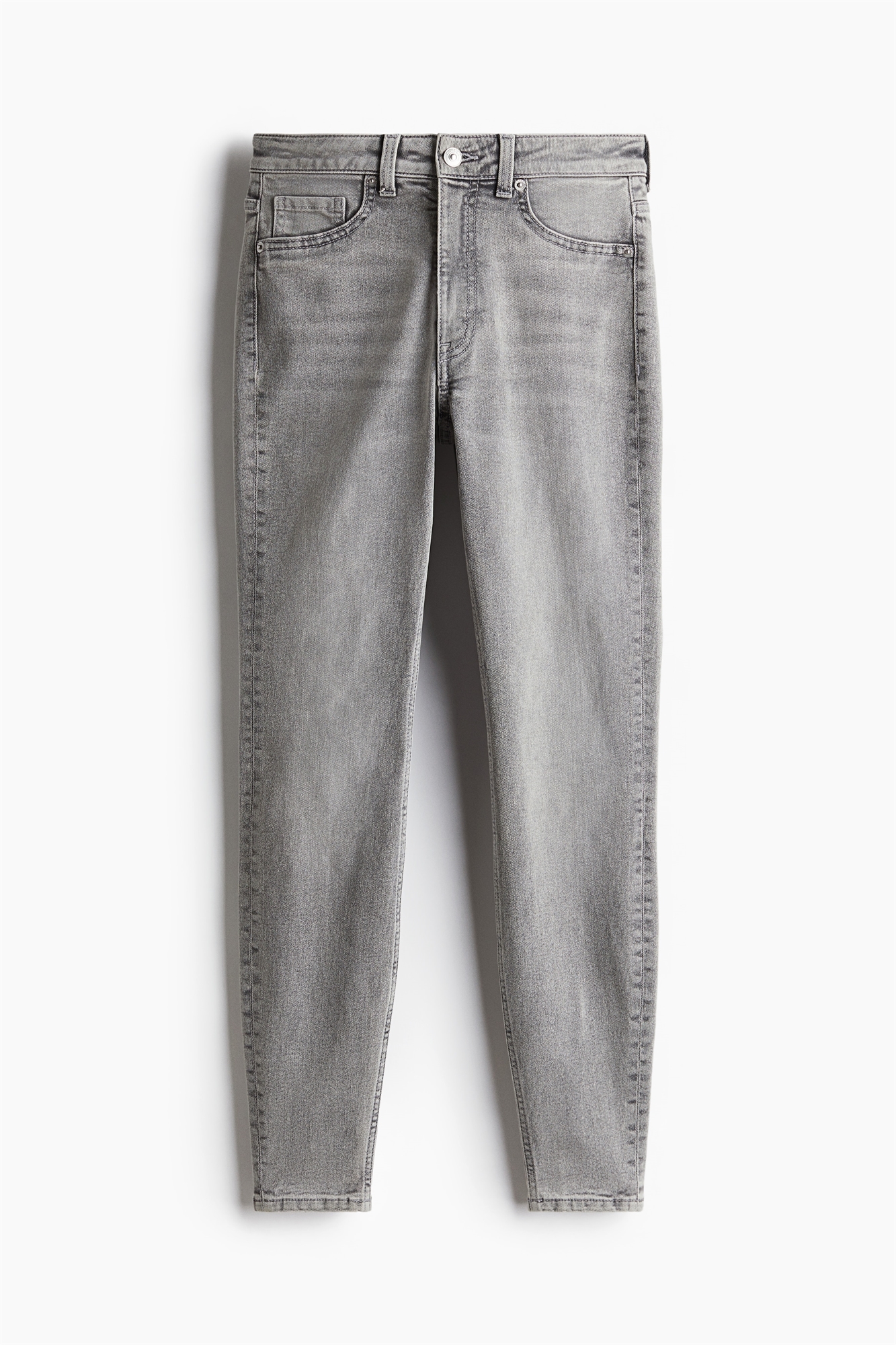 Джинсы из слегка эластичного денима с высокой талией, застежкой на молнию и пуговицу, фальшивыми передними карманами, настоящим карманом для монет, настоящими задними карманами и зауженными ногами.