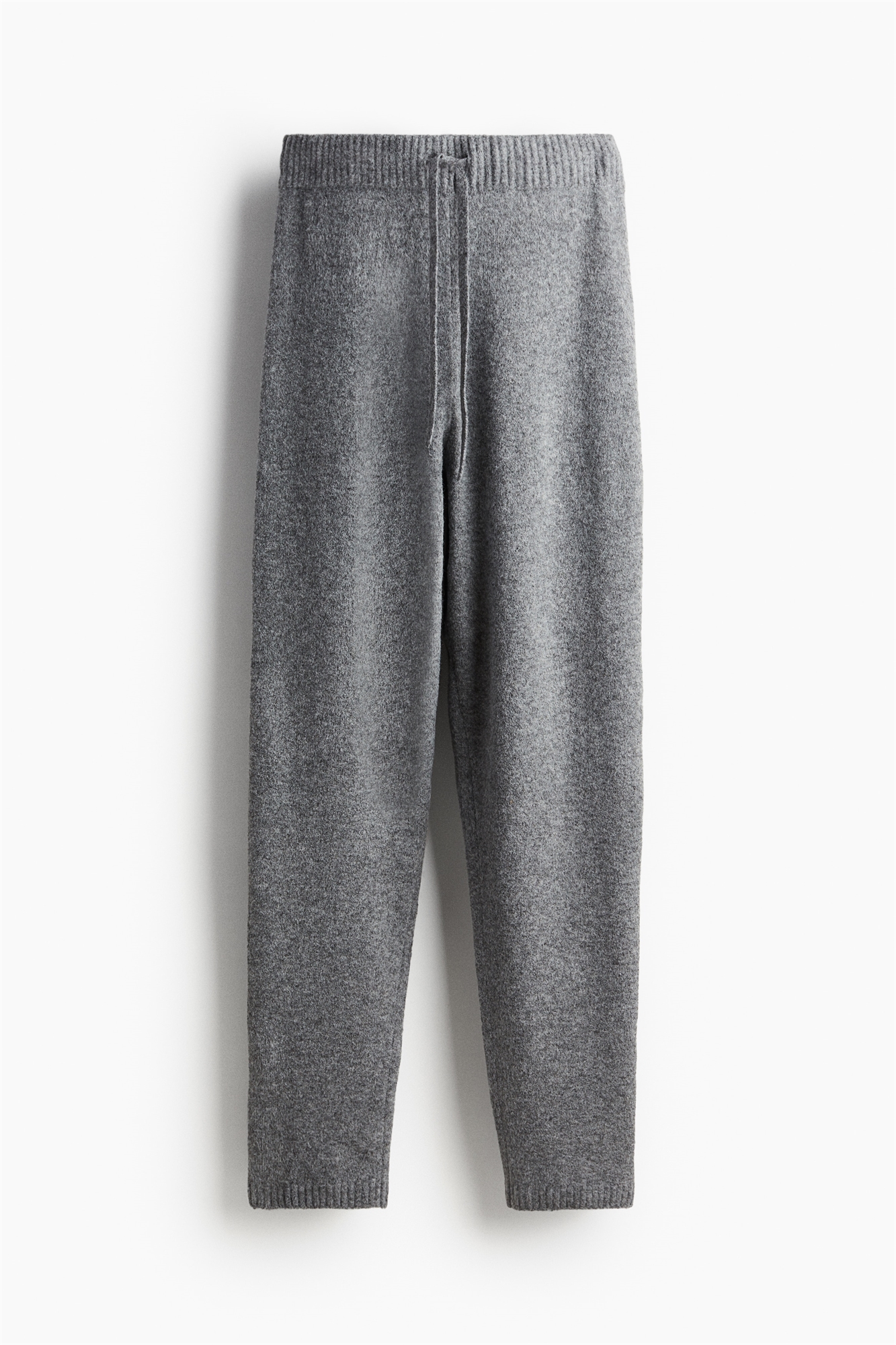 Джоггеры из мягкого, слегка начесанного трикотажа с небольшим содержанием шерсти. Высокая талия с эластичным поясом и утягивающим шнурком, зауженные ноги с ребристыми краями.