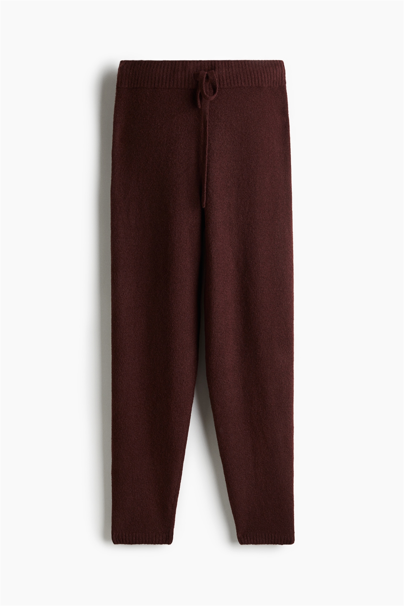 Джоггеры из мягкого, слегка начесанного трикотажа с небольшим содержанием шерсти. Высокая талия с эластичным поясом и утягивающим шнурком, зауженные ноги с ребристыми краями.