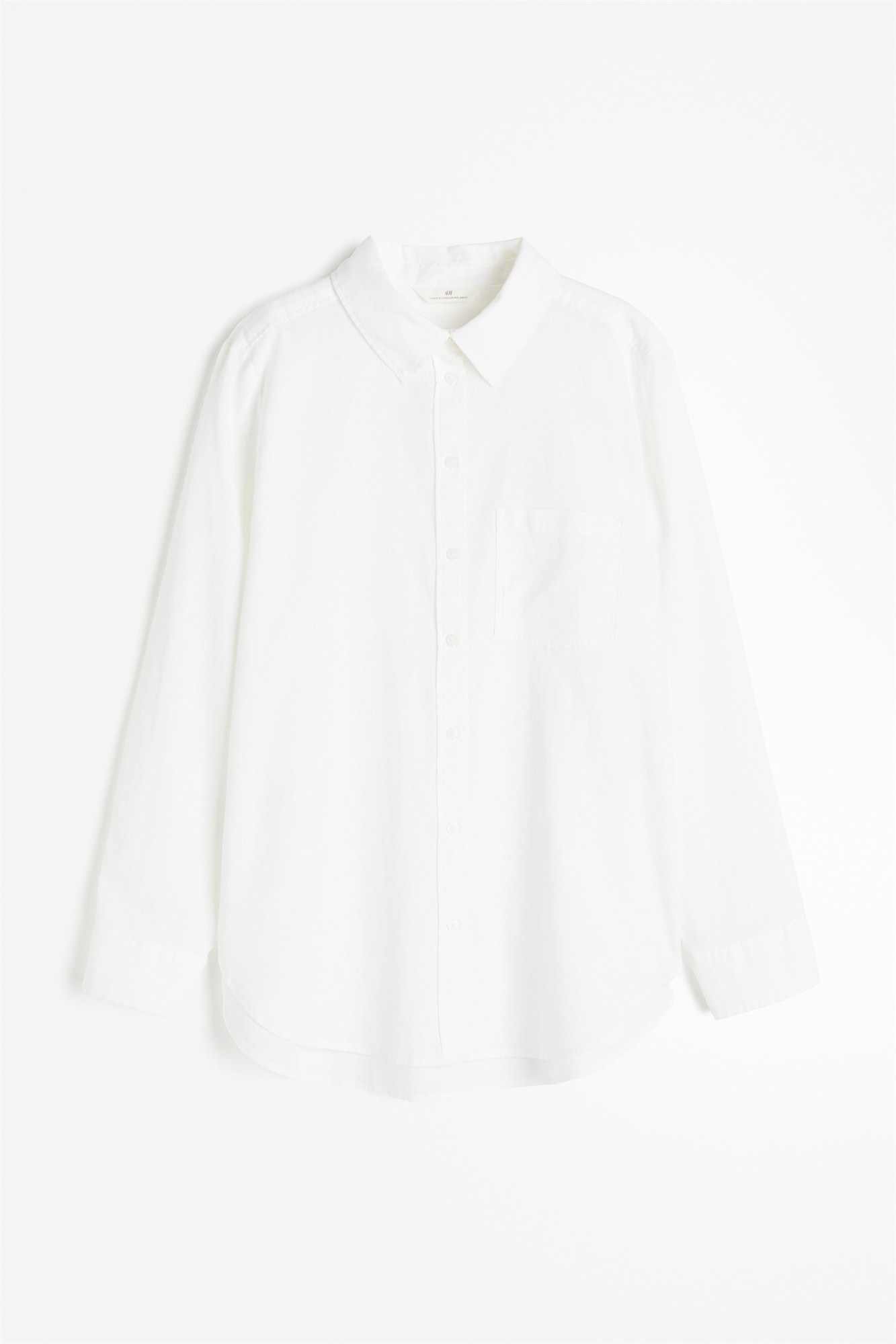 Рубашка из льна и хлопка с воротником, застежкой на пуговицы спереди и двухслойным ярмом со складкой сзади. Спущенные плечи, длинные рукава с манжетами на пуговицах, открытый нагрудный карман и закругленный подол. Немного длиннее сзади.