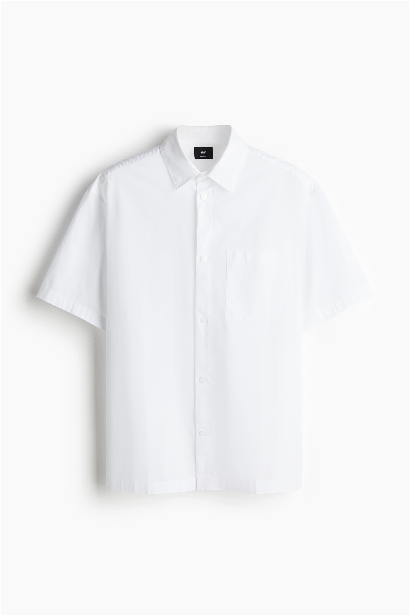 Рубашка свободного кроя из хлопкового полотна с отложным воротником, классическим передом и ярмом сзади. Открытый нагрудный карман, короткие рукава и прямой подол.