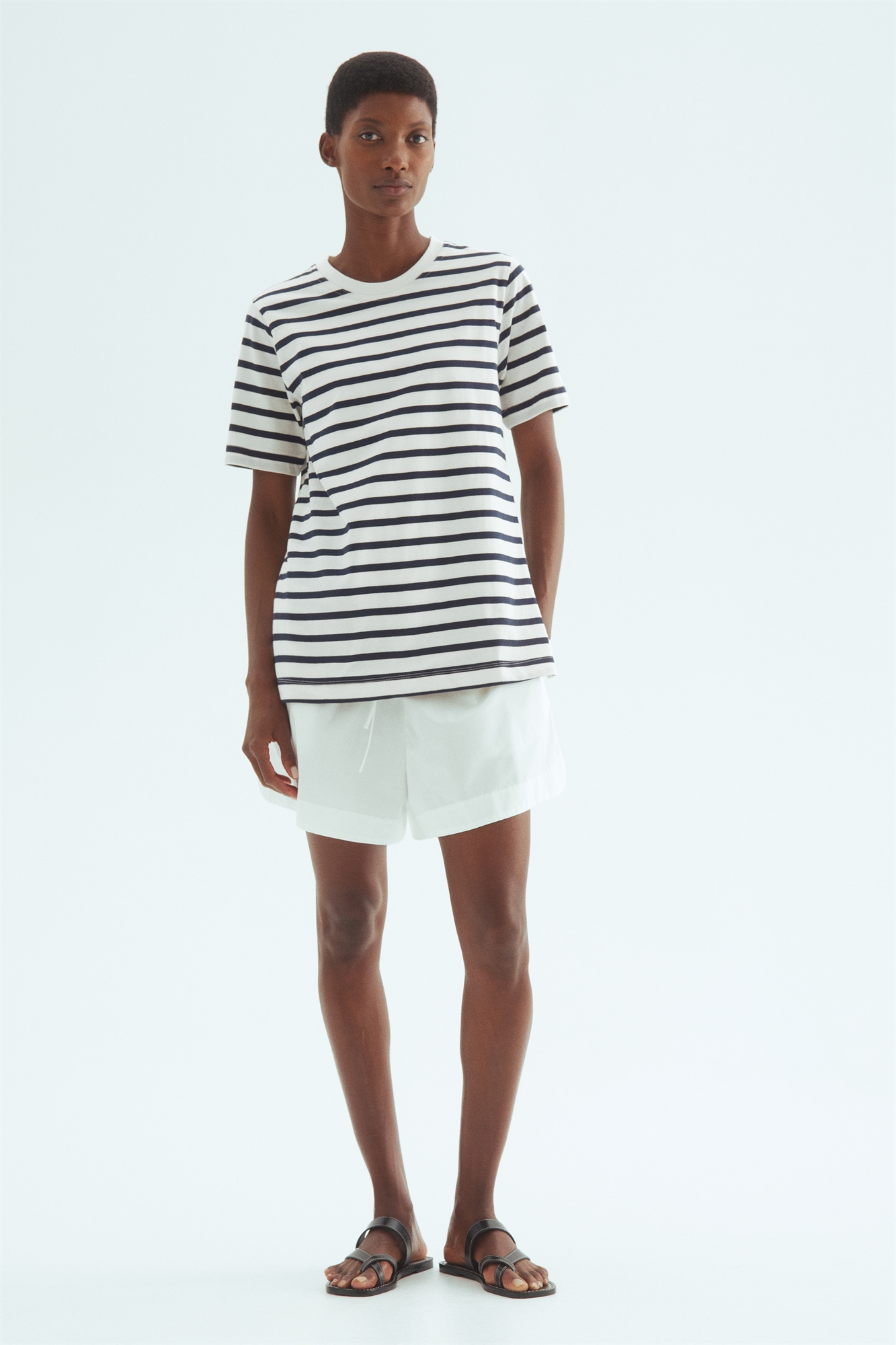 Топы для кормления из мягкого трикотажа в классическом стиле футболки с двойным слоем спереди и практичным внутренним верхом для облегчения доступа к груди. Круглый вырез и спущенные плечи.