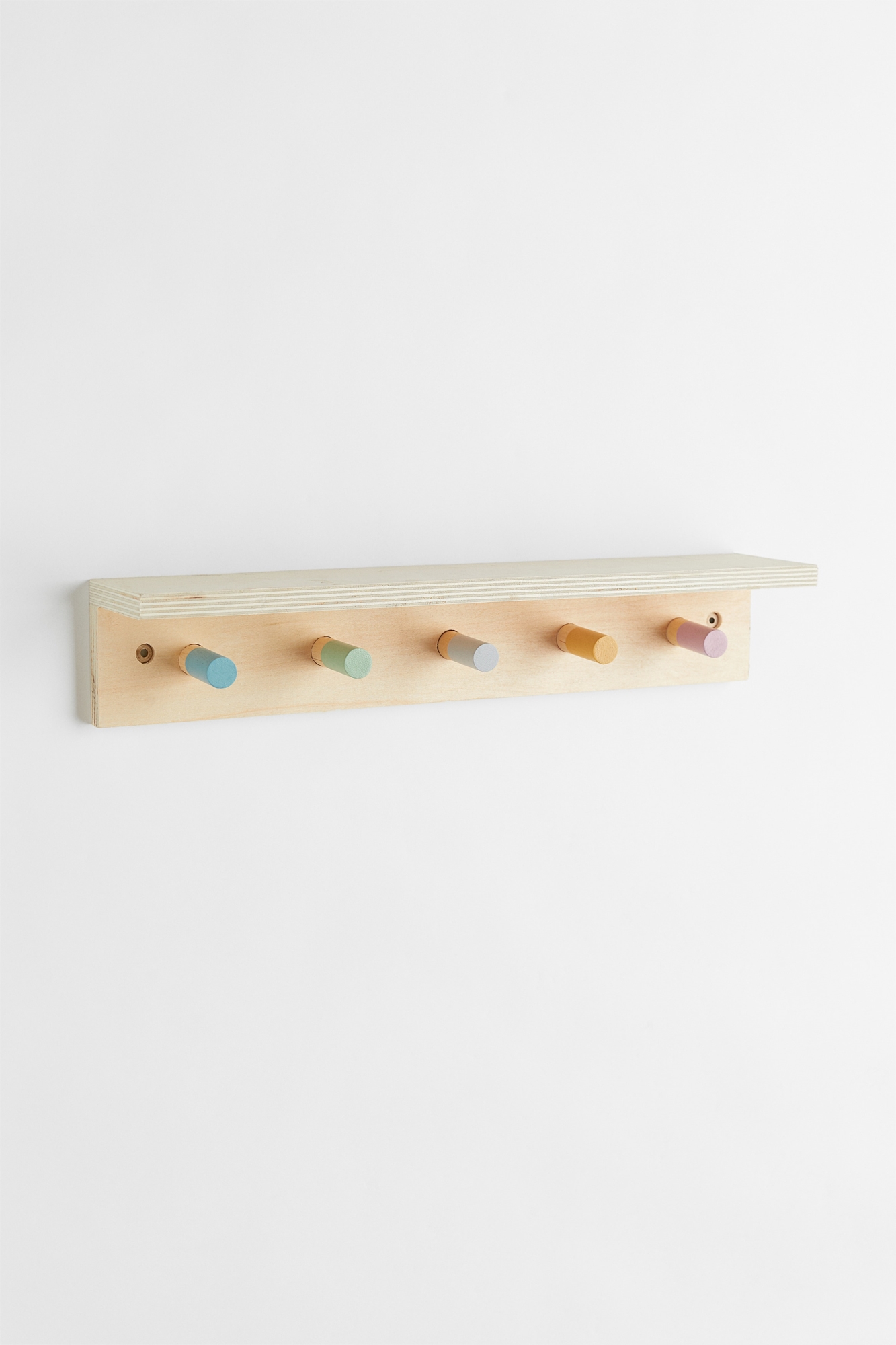 Полка из фанеры с пятью прищепками в игривых цветах внизу. Предварительно просверленные отверстия для подвешивания. Шурупы в комплект не входят. Глубина 7 см. Ширина 38 см.