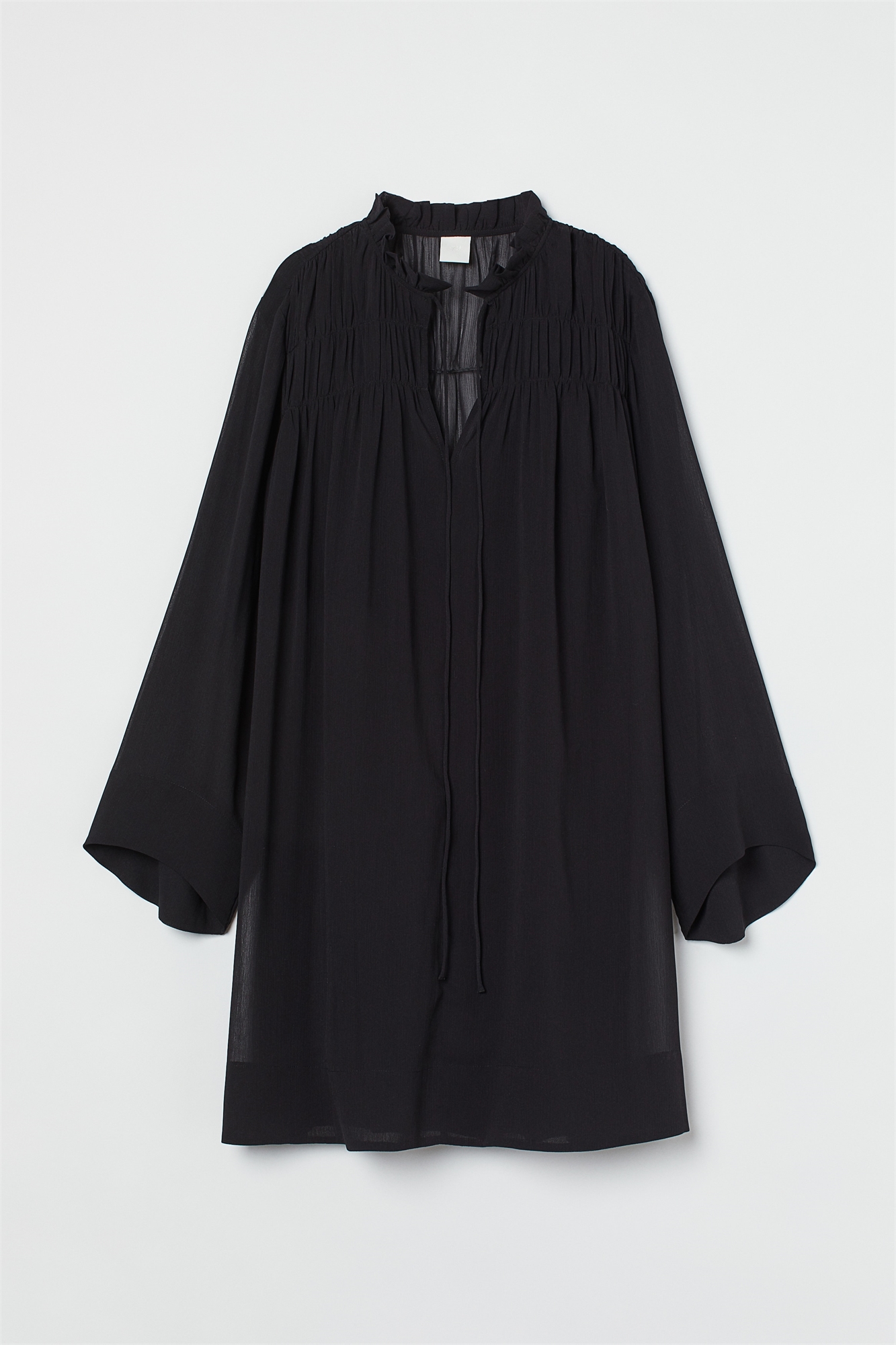 Короткое платье из нежного мятого шифона. Платье имеет V-образную пройму с завязками и узкий волан в верхней части. Собранное ярмо обеспечивает ширину и красивую драпировку. На подкладке.