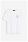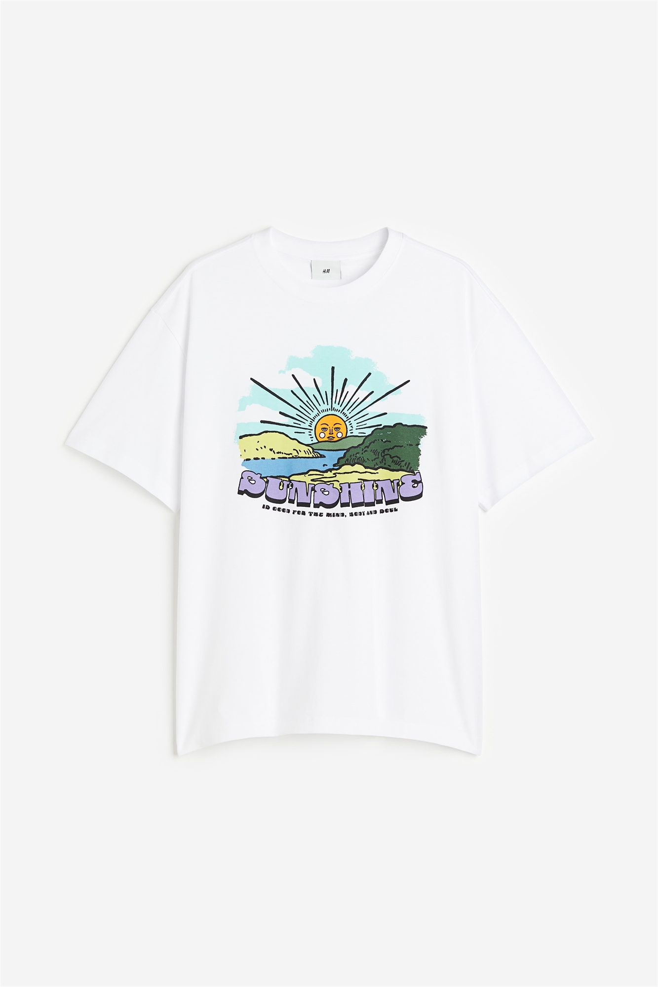 Футболка из хлопкового джерси средней плотности с принтом, круглым вырезом с ребристой отделкой, спущенными плечами и прямым покроем. Свободный крой для объемного, но не чрезмерного силуэта.