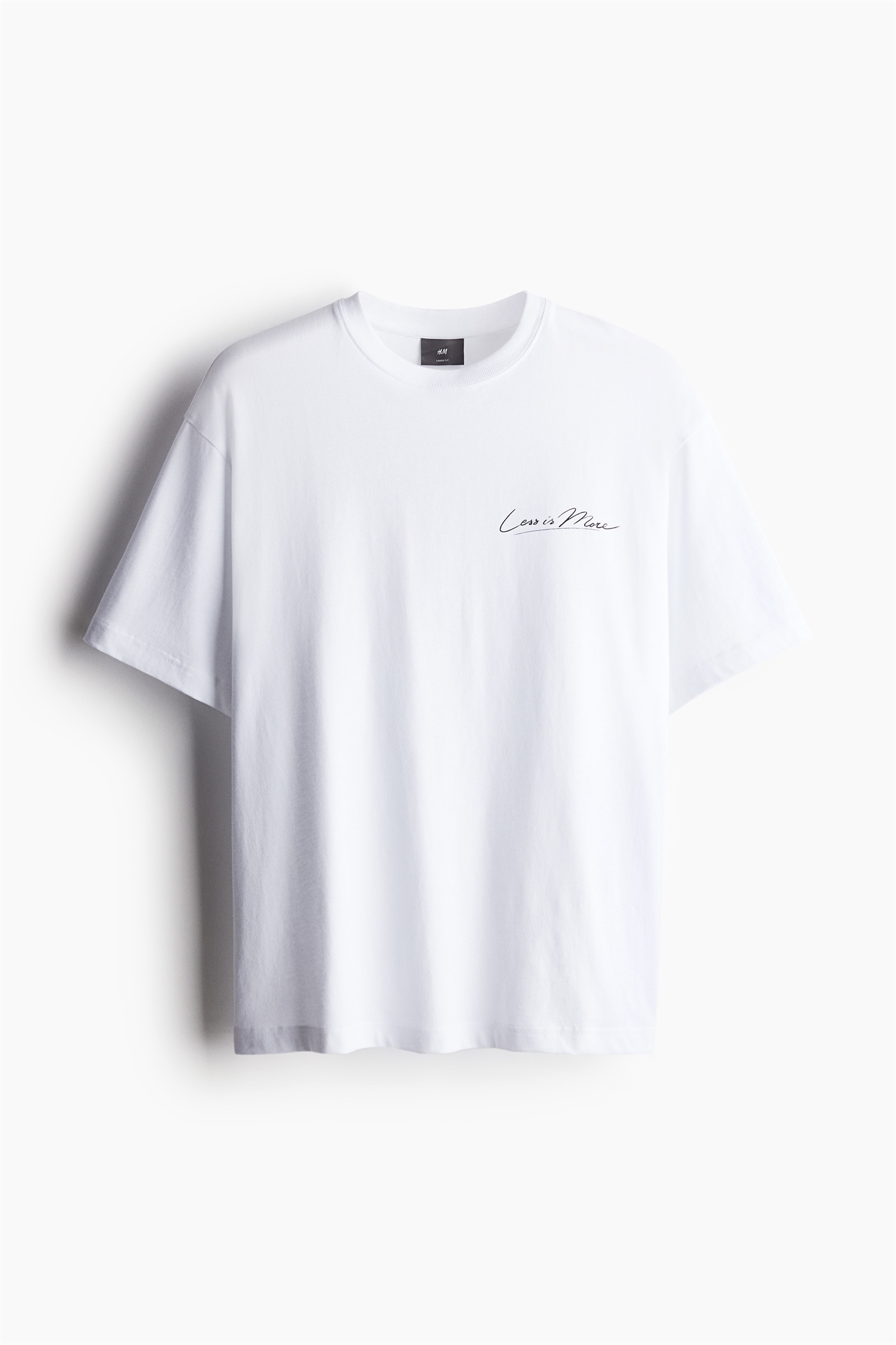 Футболка из принтованного хлопкового джерси средней плотности с круглым вырезом в рубчик и спущенными плечами. Свободный крой для объемного, но не чрезмерно большого силуэта.