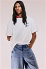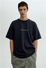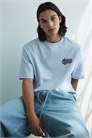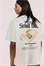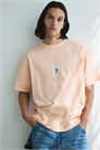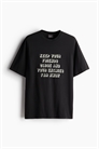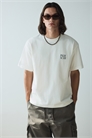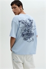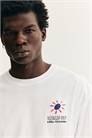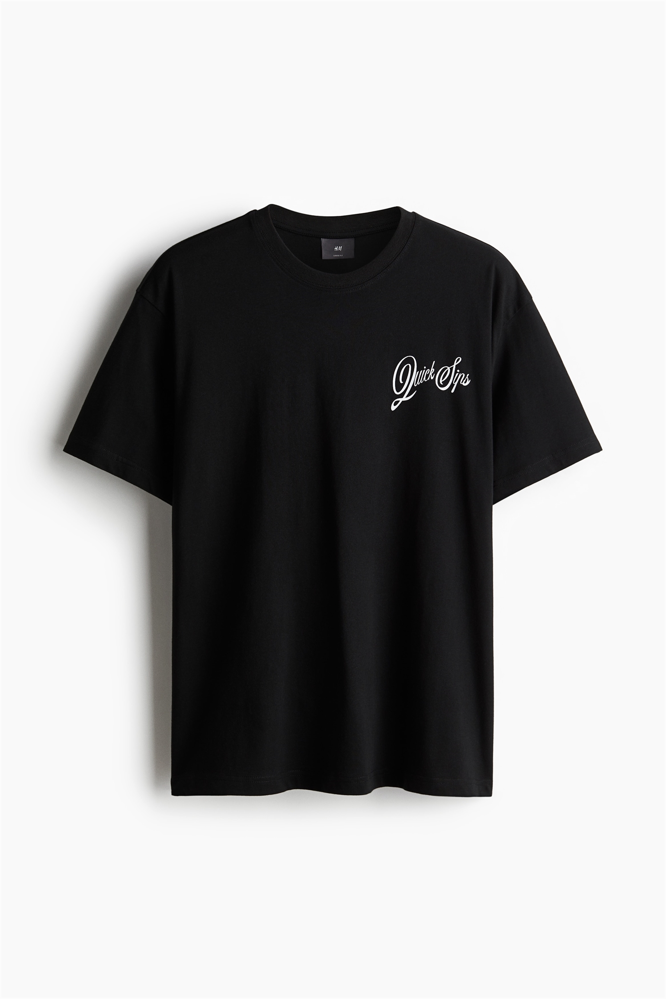 Футболка из принтованного хлопкового джерси средней плотности с круглым вырезом в рубчик и спущенными плечами. Свободный крой для объемного, но не чрезмерно большого силуэта.