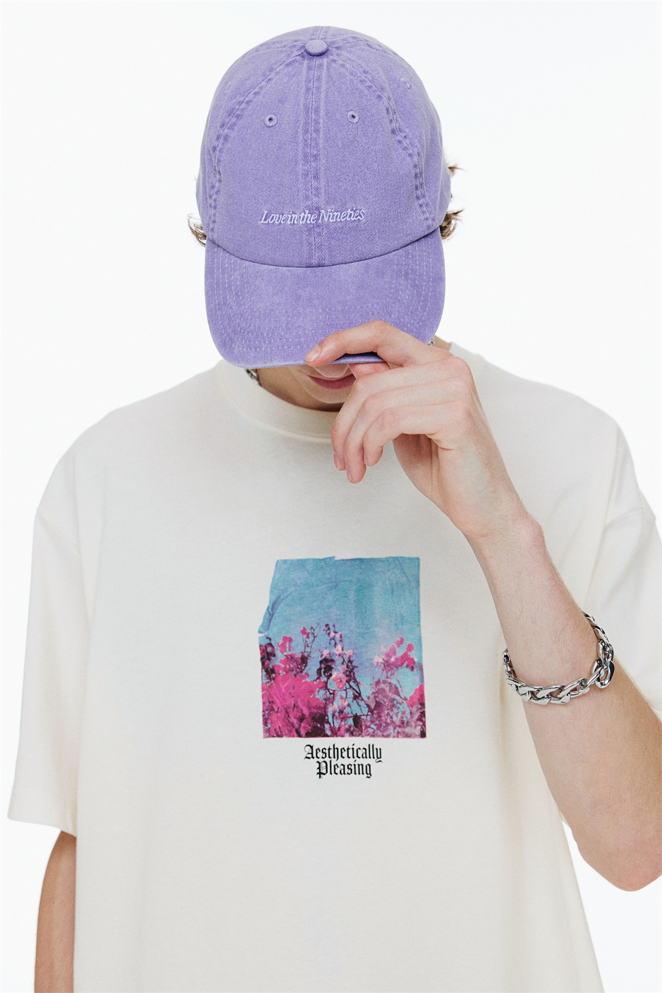 Футболка из принтованного хлопкового джерси средней плотности с круглым вырезом в рубчик и спущенными плечами. Свободный крой для объемного, но не чрезмерно большого силуэта.