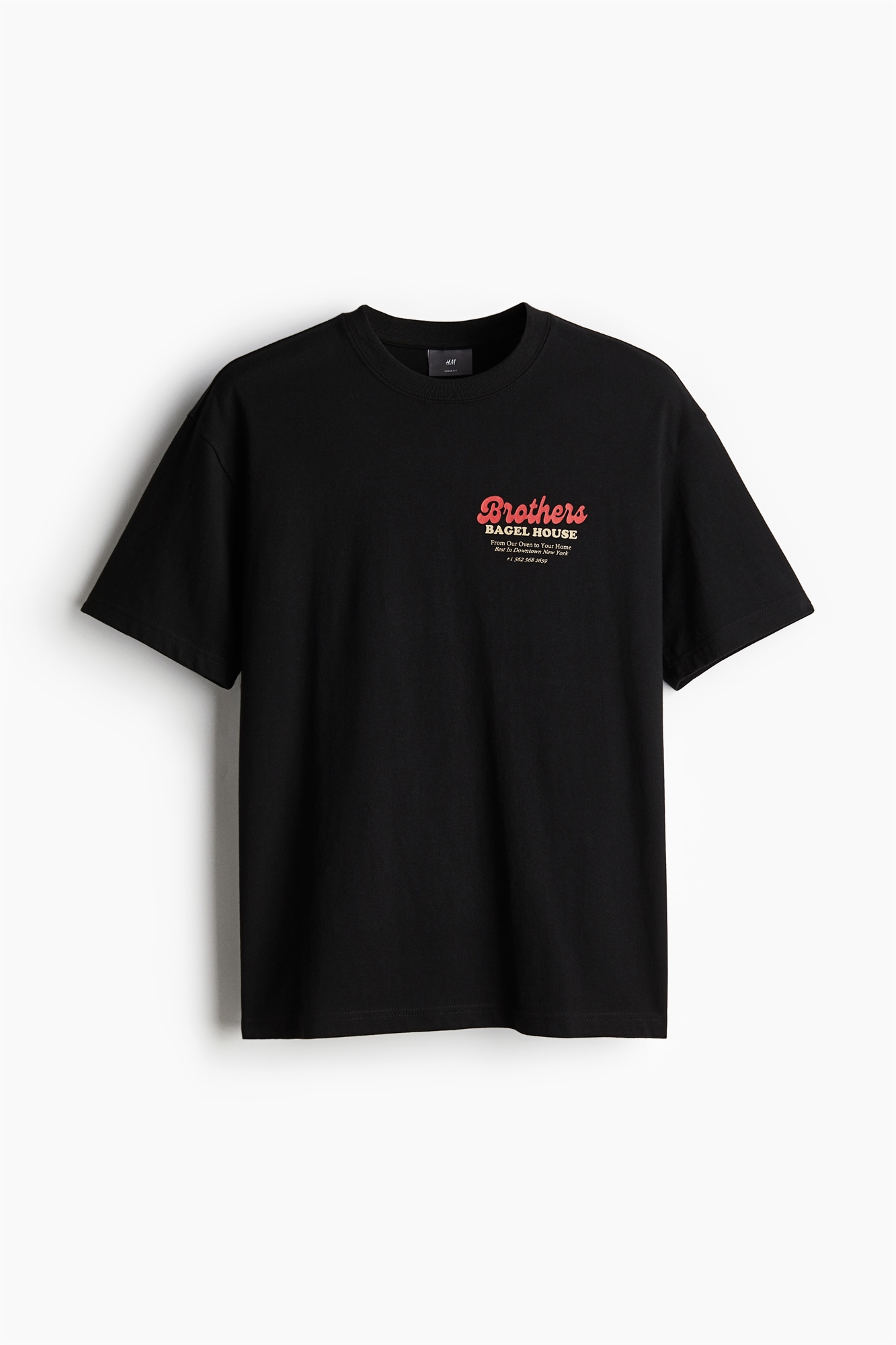 Футболка из принтованного хлопкового джерси средней плотности с круглым вырезом в рубчик и спущенными плечами. Свободный крой для объемного, но не чрезмерно большого силуэта.