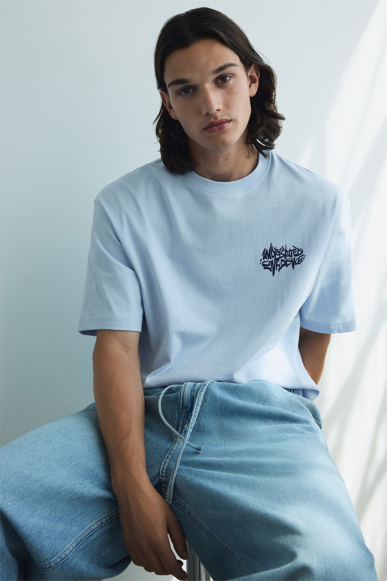Футболка из принтованного хлопкового джерси средней плотности с круглым вырезом в рубчик и спущенными плечами. Свободный крой для объемного, но не чрезмерно большого силуэта.
