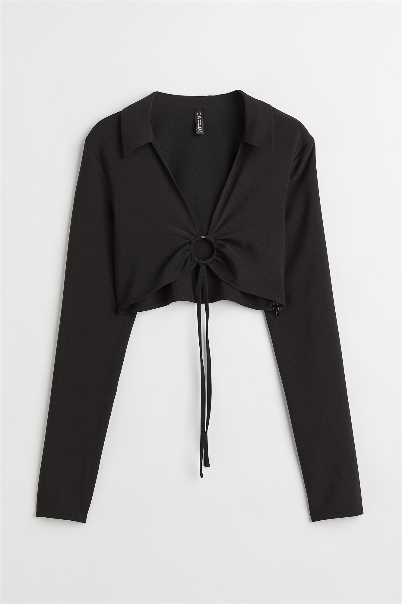Облегающий топ из тканого материала с воротником, V-образным вырезом и длинными рукавами. Декоративное закрытое кольцо спереди с длинными завязками.