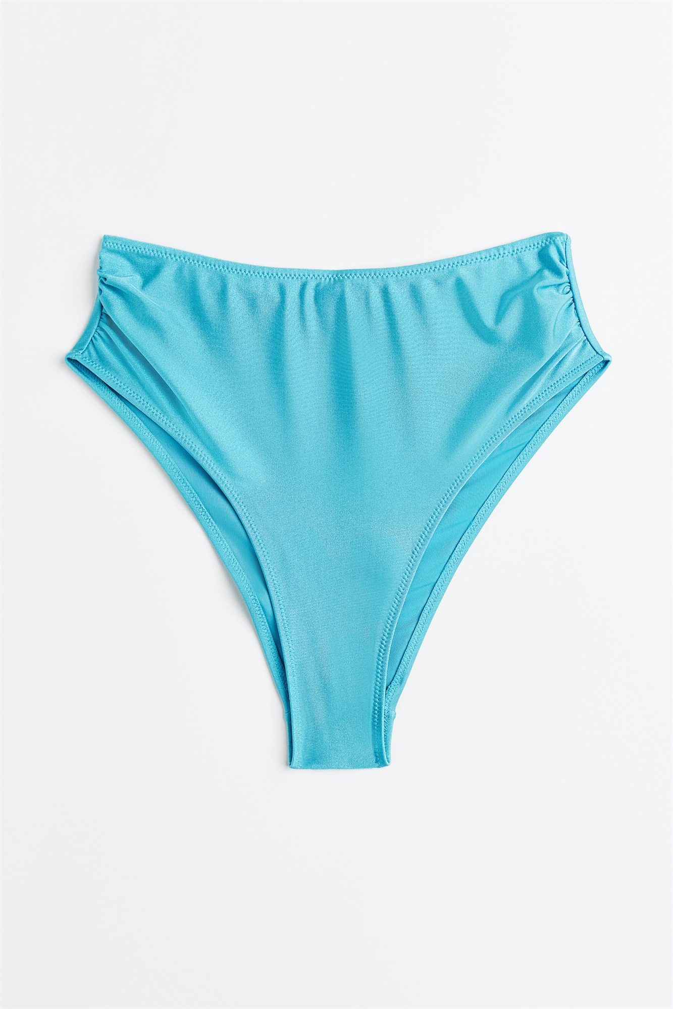 Полностью на подкладке, бикини на талии, со сборками по бокам и высоким разрезом сзади.