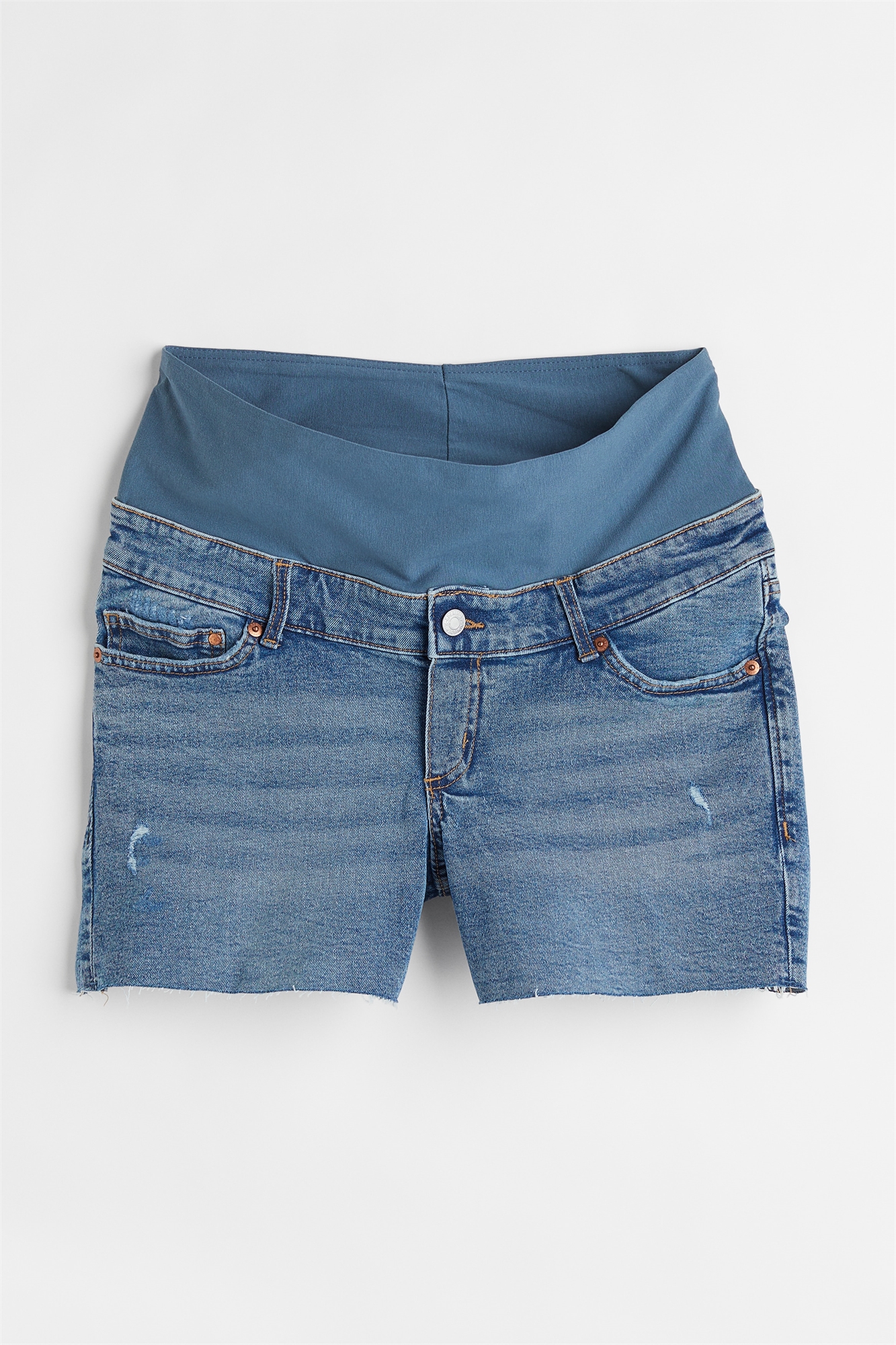 Шорты с 5 карманами из хлопкового денима стретч с широкой панелью из джерси на талии для лучшей посадки на животе, фальшивой ширинкой и необработанными краями.