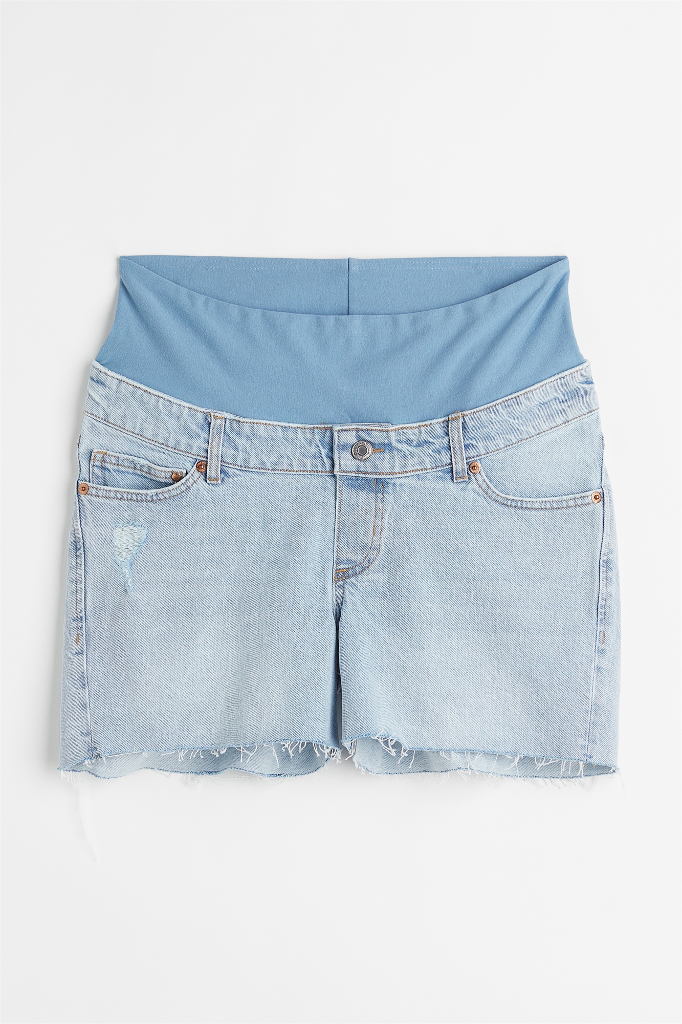 Шорты с 5 карманами из хлопкового денима стретч с широкой панелью из джерси на талии для лучшей посадки на животе, фальшивой ширинкой и необработанными краями.
