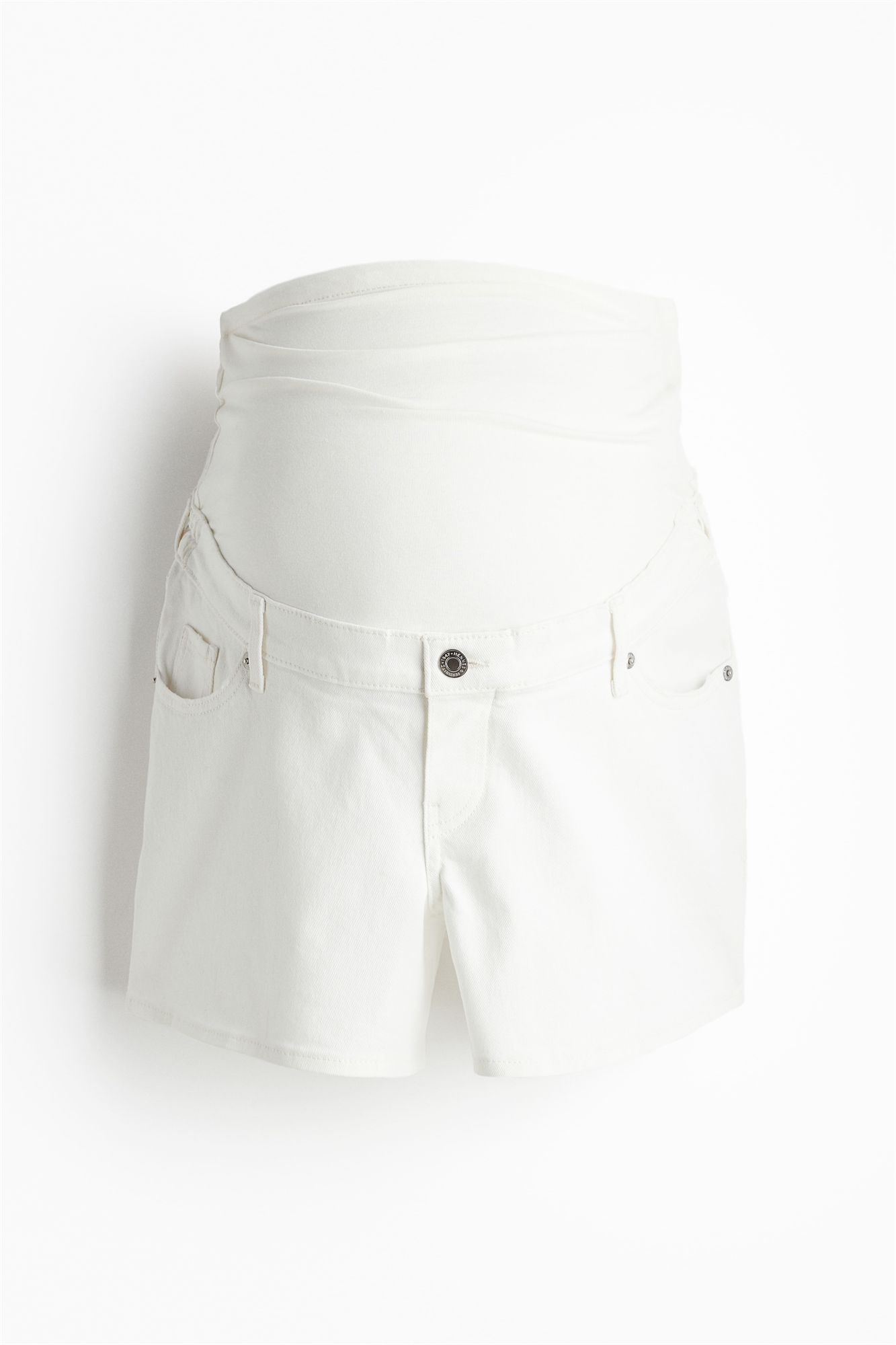 Шорты с 5 карманами из хлопкового денима стретч с широкой панелью из джерси на талии для лучшей посадки на животе, фальшивой ширинкой и необработанными краями.