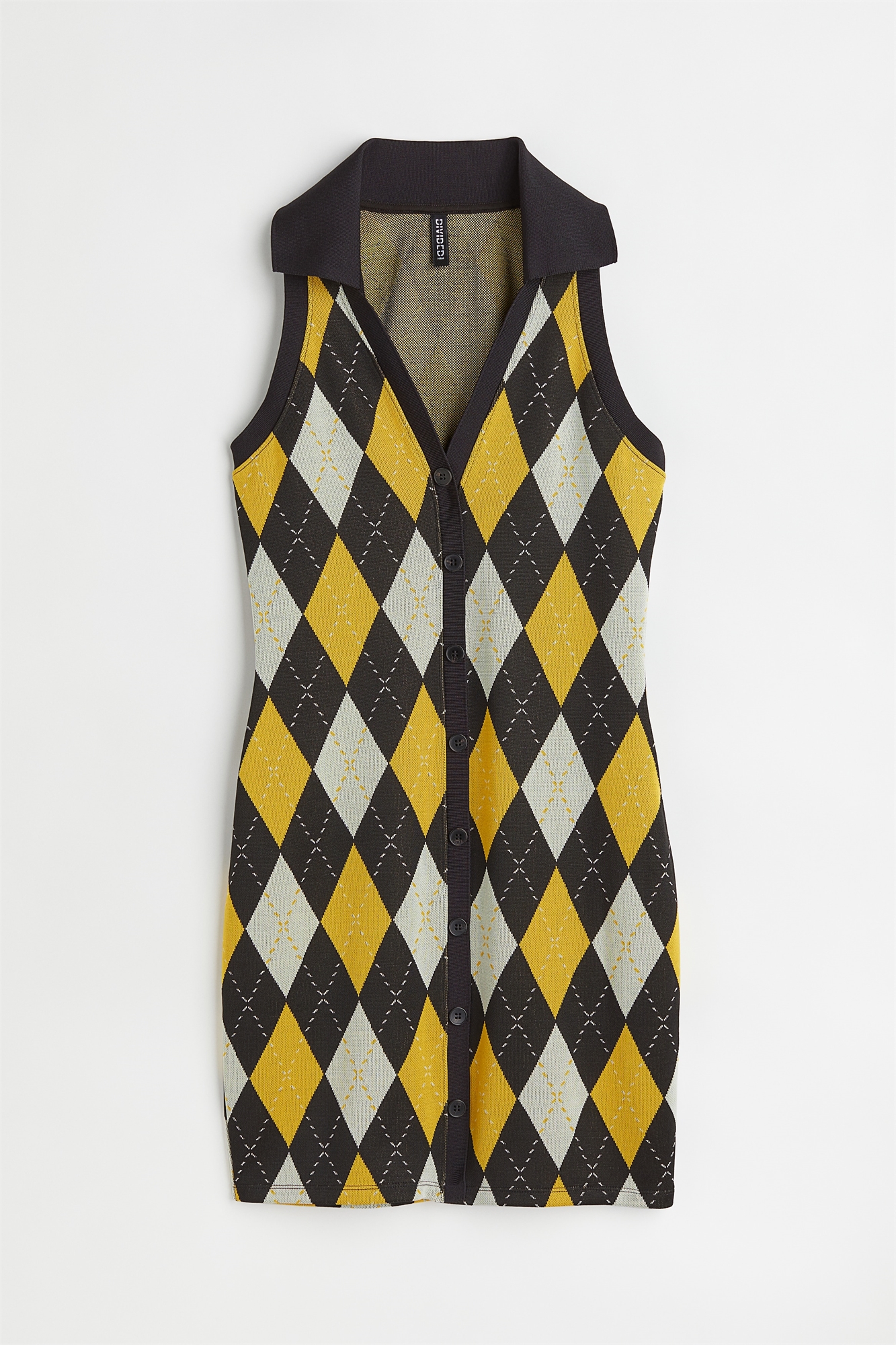 Короткое платье из жаккардового трикотажа без рукавов, облегающее фигуру. Облегающий крой в верхней части, воротник и застежка на пуговицы спереди.