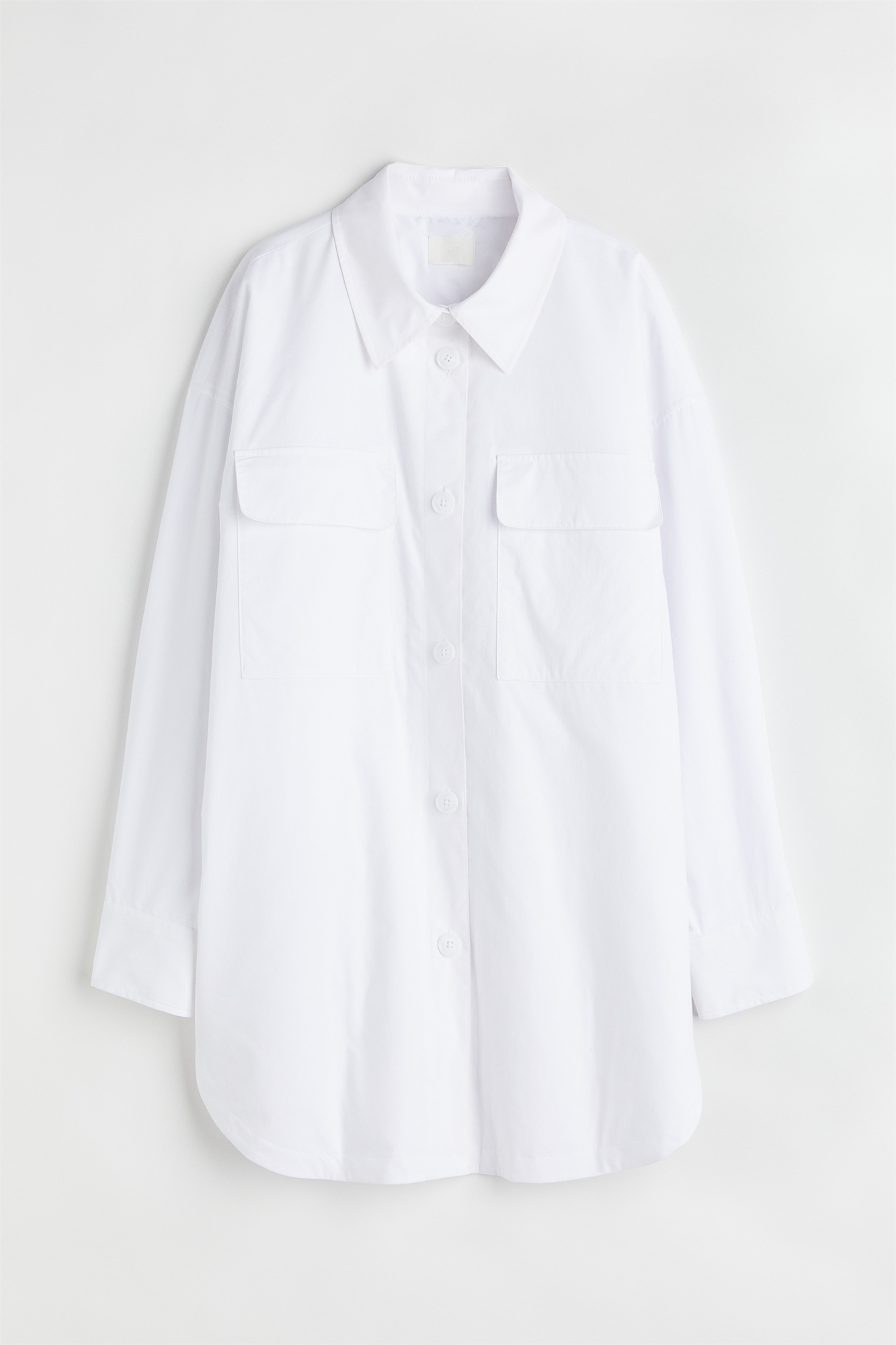 Рубашка большого размера с легкой набивкой, воротником, застежкой на пуговицы спереди и накладными нагрудными карманами. Спущенные плечи, длинные рукава с манжетами на пуговицах и закругленный подол. На подкладке.