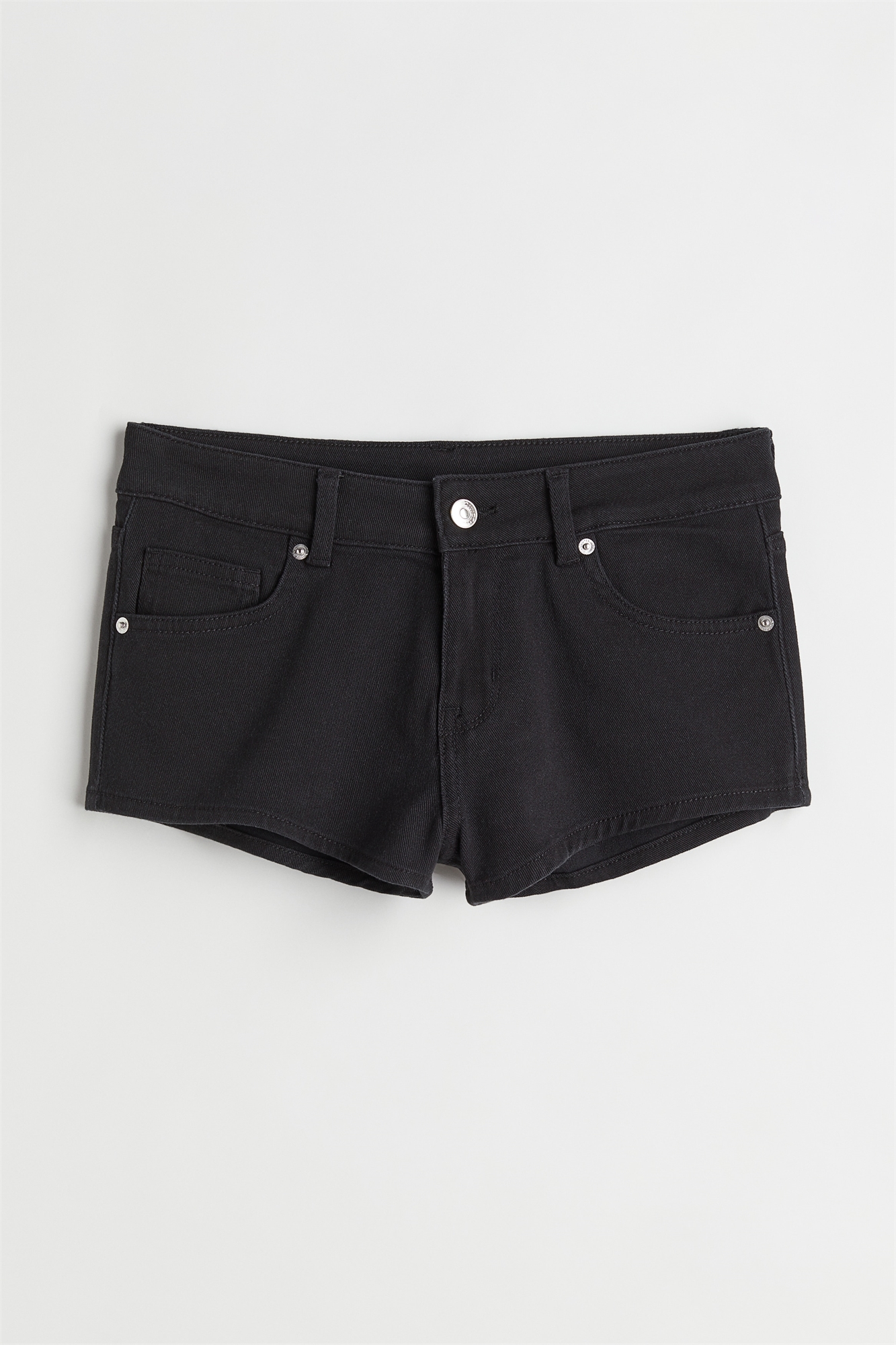 Короткие приталенные шорты с 5 карманами из эластичной хлопковой саржи с заниженной талией и ширинкой на молнии и пуговице.