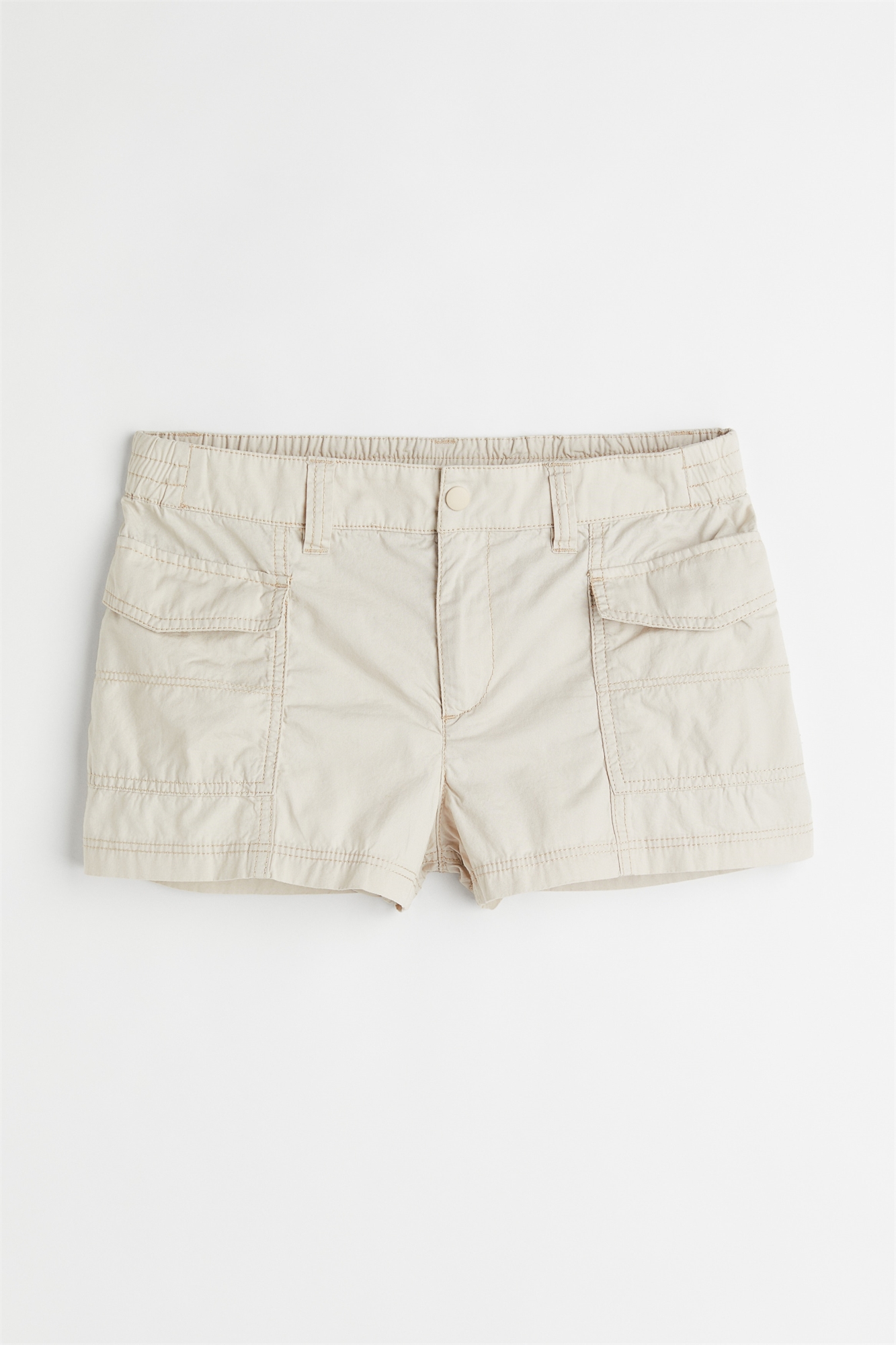 Короткие шорты-карго из тканого материала. Регулярная талия с утяжкой, ширинкой на молнии и кнопкой, а также боковыми карманами с клапанами.