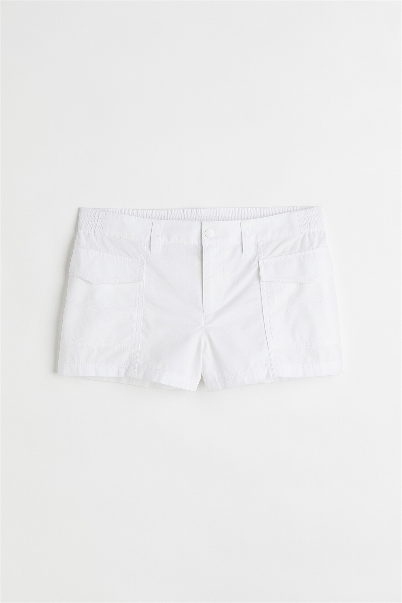 Короткие шорты-карго из тканого материала. Регулярная талия с утяжкой, ширинкой на молнии и кнопкой, а также боковыми карманами с клапанами.