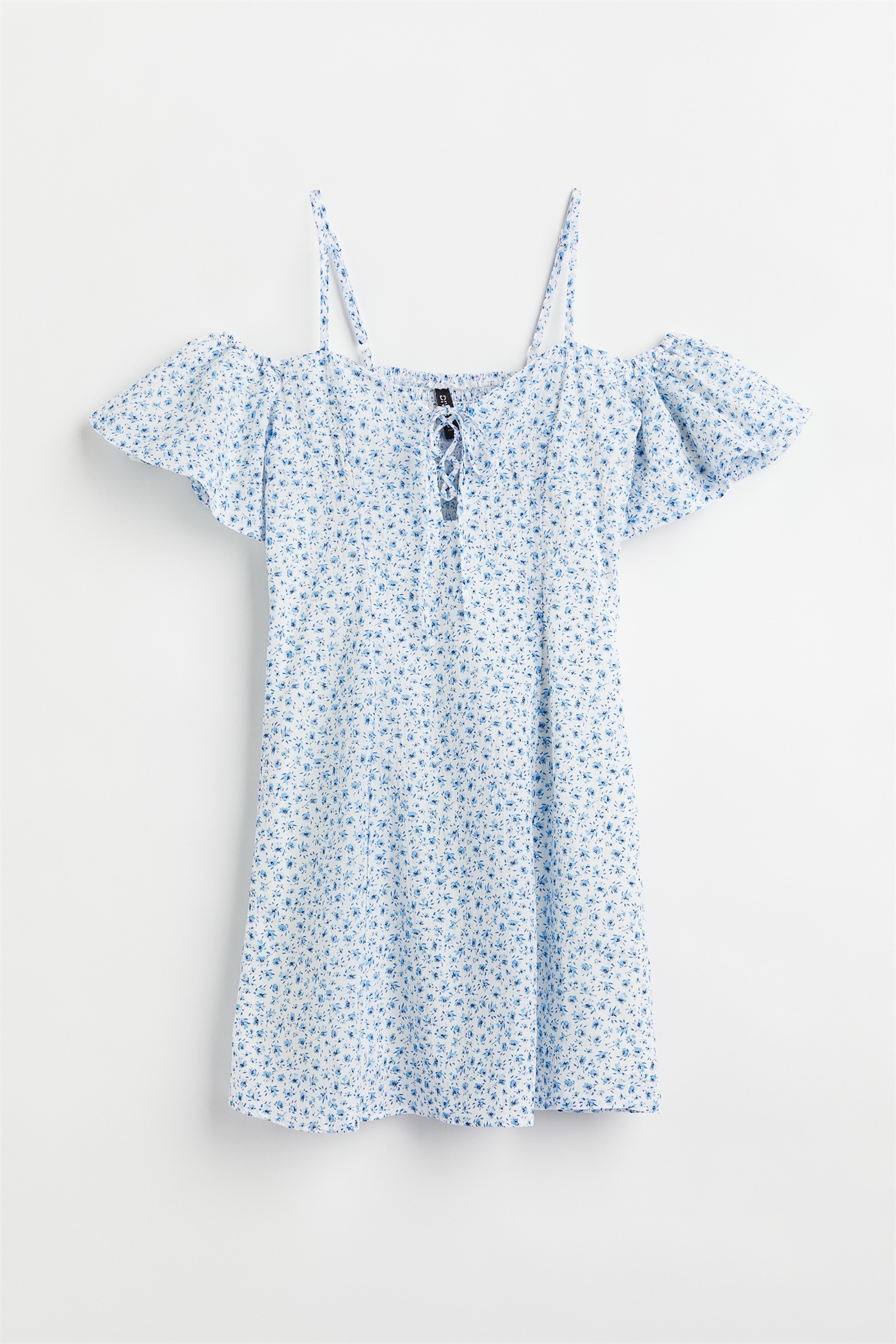 Короткое платье на холодное плечо из фактурного хлопкового полотна с приталенным лифом и расклешенной юбкой. Узкие регулируемые бретели, платочная вставка сзади и короткие рукава с узкой, закрытой резинкой в верхней части и двумя воланами. Застежка на шнуровке спереди. На подкладке в области бюста.