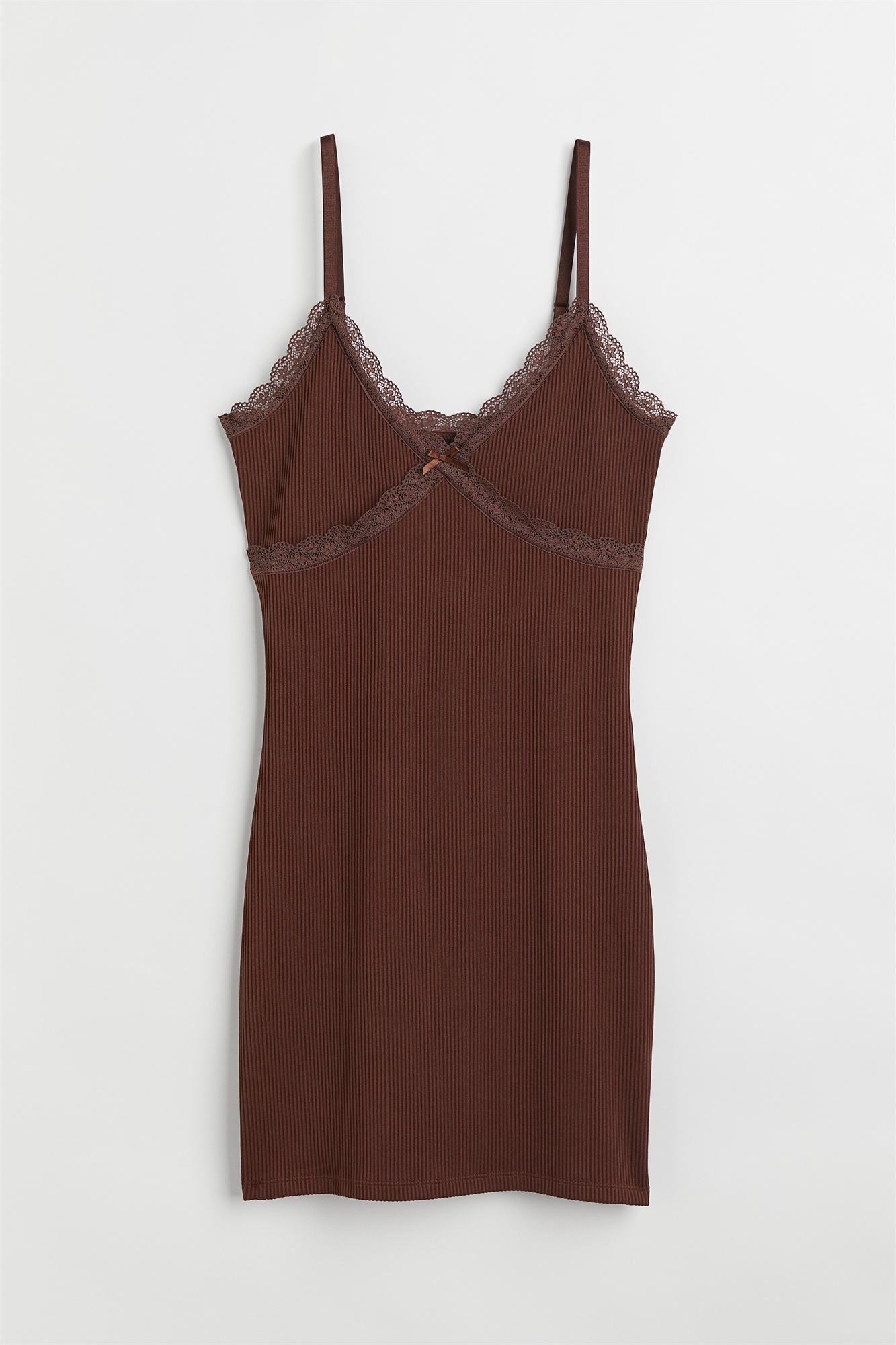 Короткое платье из ребристого трикотажа с узкими регулируемыми бретелями и V-образным вырезом с кружевным декором в верхней части. Без подкладки.