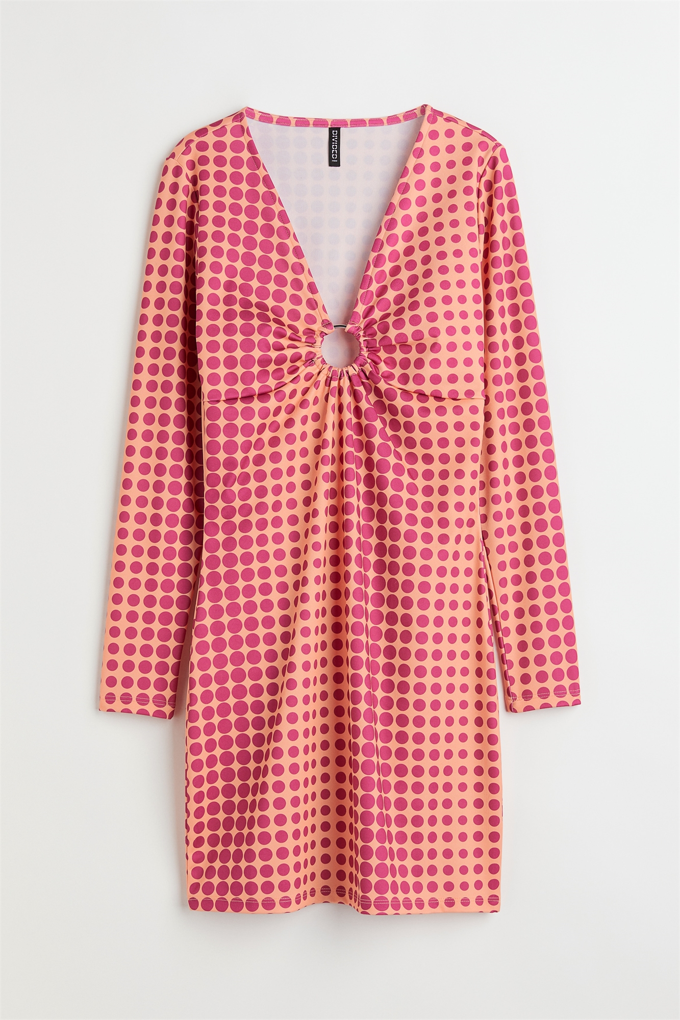 Короткое приталенное платье с точечным принтом из джерси-стрейч с длинными рукавами и глубоким V-образным вырезом с металлическим кольцом спереди для создания эффекта драпировки на бюсте.