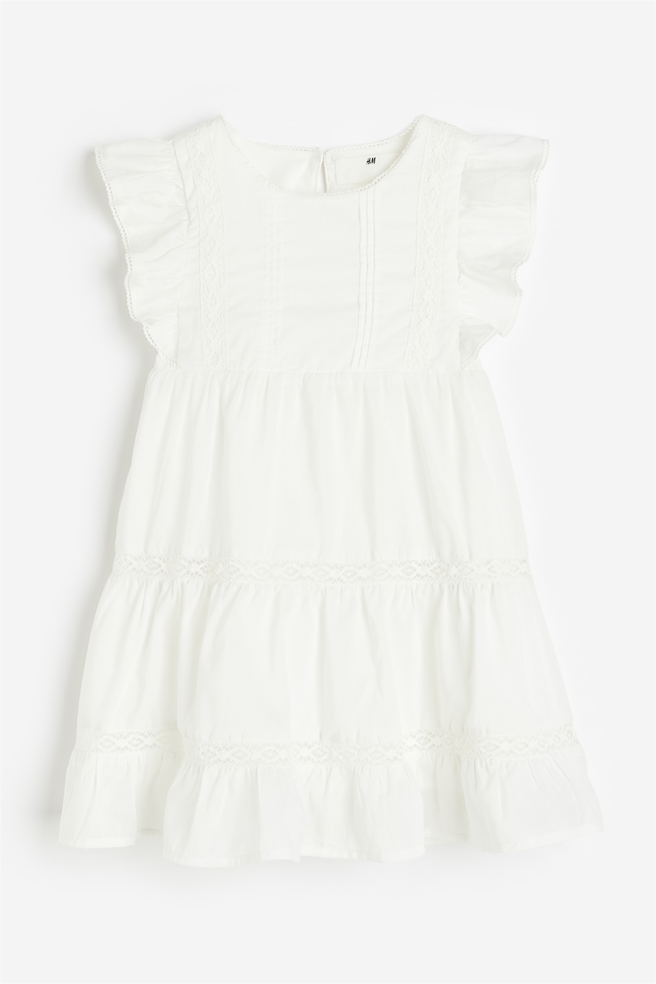 Платье длиной до колена из мягкого модала и хлопка с кружевными вставками спереди и на юбке. Круглый вырез, проймы с отделкой воланами и булавки спереди. Швы на талии и вокруг юбки для придания дополнительной ширины, а также волан на подоле. На подкладке.