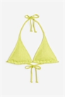 Фактурный бикини-треугольник на подкладке, без проводов. Узкие завязки сзади и на шее, чашечки со съемными вставками, которые формируют бюст и обеспечивают хорошую поддержку.