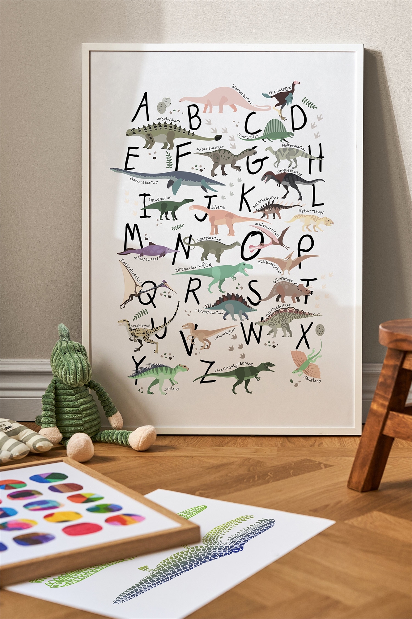 Пора учить алфавит? Пусть этот игривый плакат поможет вам и заодно познакомит с динозаврами! Плакат "Азбука Дино" станет прекрасным принтом для детской комнаты, и с ним можно сочетать другие мотивы с динозаврами!